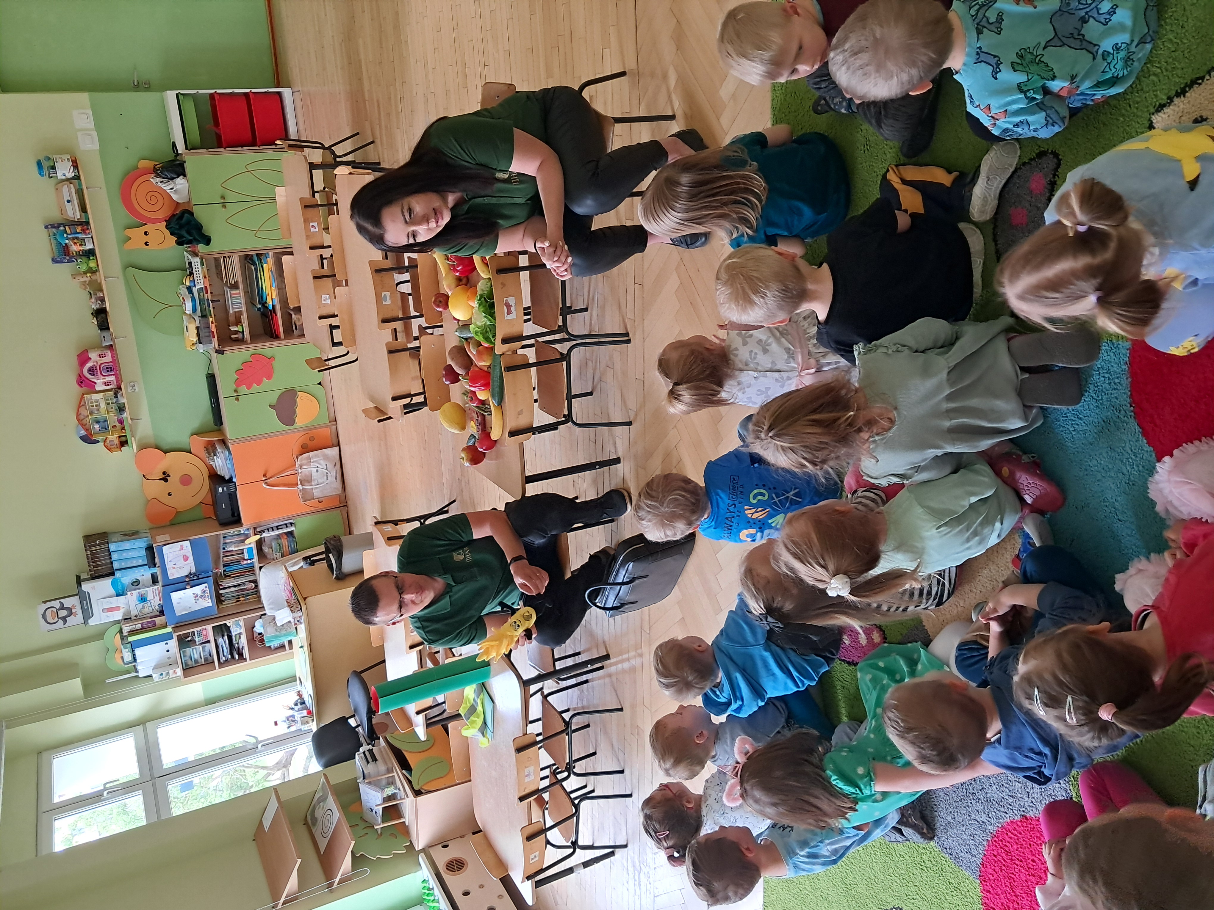 W dalszej części zajęć odbyła się pogadanka na temat przyniesionych przez dzieci owoców i warzyw. Wspólnie omawiano, które z nich są owocami, a które warzywami, gdzie rosną, czy można je jeść ze skórką, jaki mają kolor i kształt. Zajęcia miały charakter interaktywny – dzieci aktywnie włączały się w rozmowę i chętnie dzieliły się swoją wiedzą.