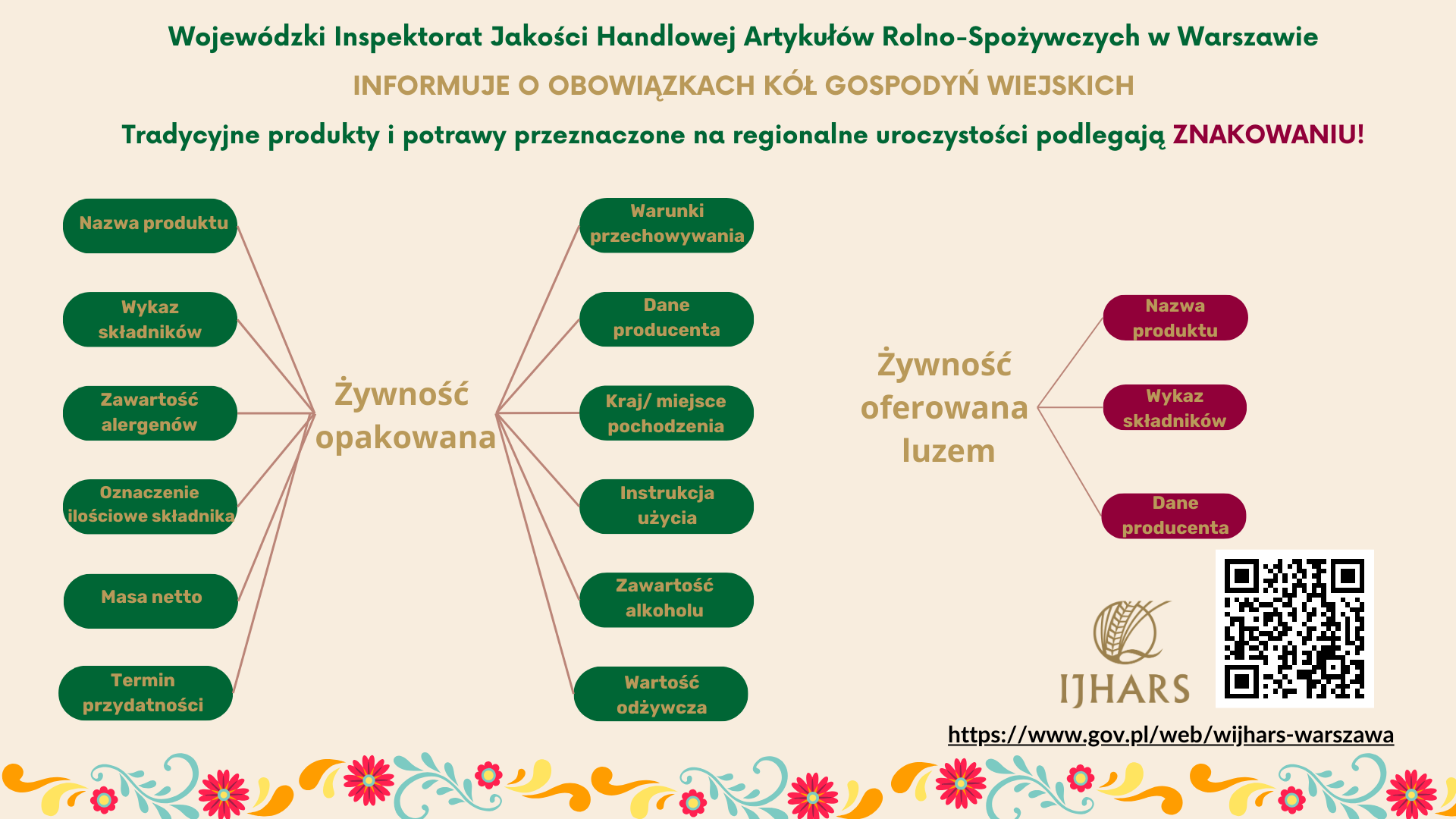 Doceniając regionalne i tradycyjne produkty i potrawy kulinarne chcemy wesprzeć Koła Gospodyń Wiejskich. Aby pomóc, przygotowaliśmy broszurę i infografiką, które mają na celu przedstawienie zagadnienia znakowania artykułów rolno - spożywczych, poprzez wskazanie zakresu wymaganych informacji dla konsumentów.