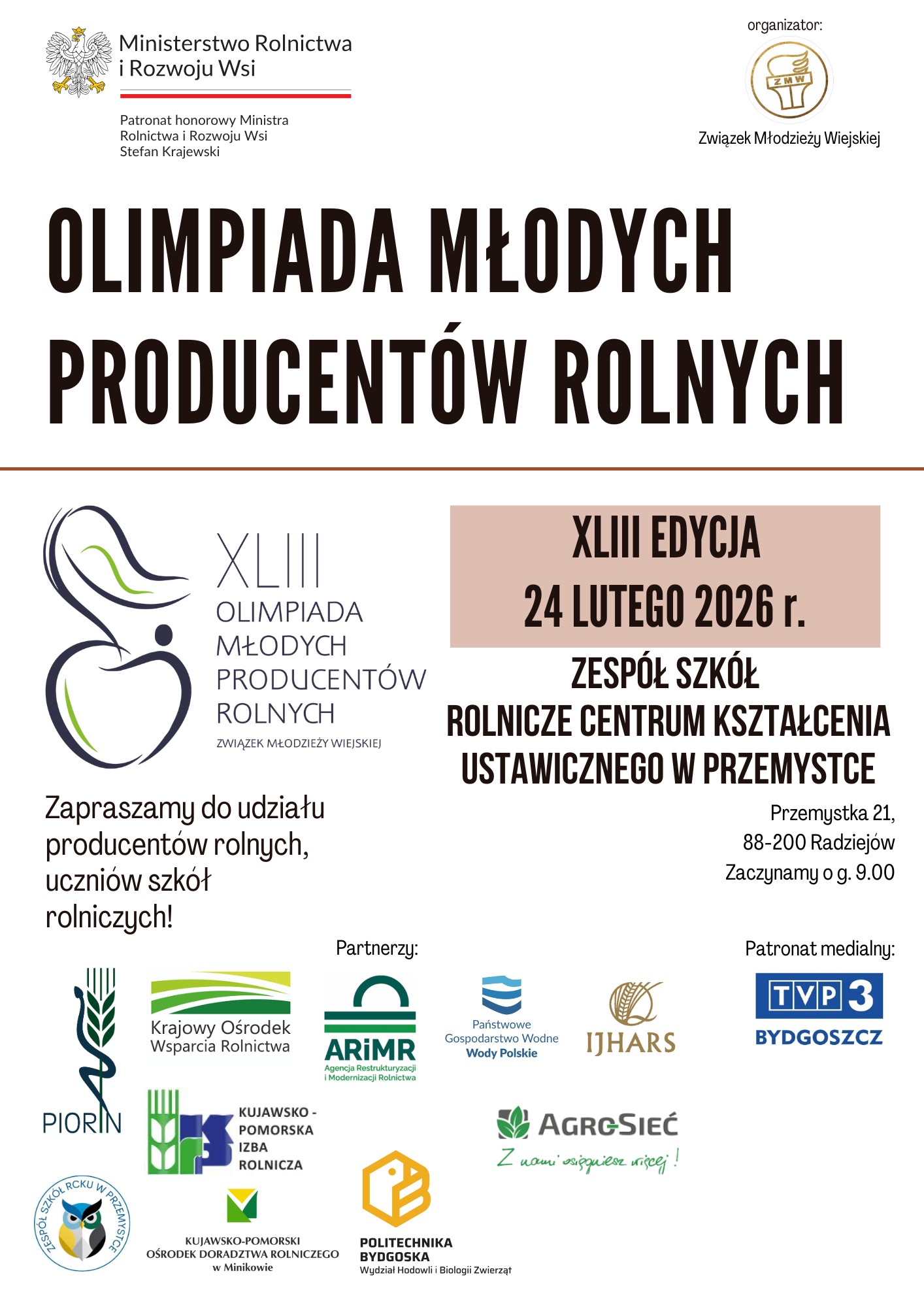 24 lutego 2026 r. w Zespole Szkół Rolnicze Centrum Kształcenia Ustawicznego w Przemystce odbył się Finał Wojewódzki XLIII Olimpiady Młodych Producentów Rolnych. Wydarzenie zostało zorganizowane przez Zarząd Młodzieży Wiejskiej, przy współudziale szkoły - gospodarza etapu wojewódzkiego.