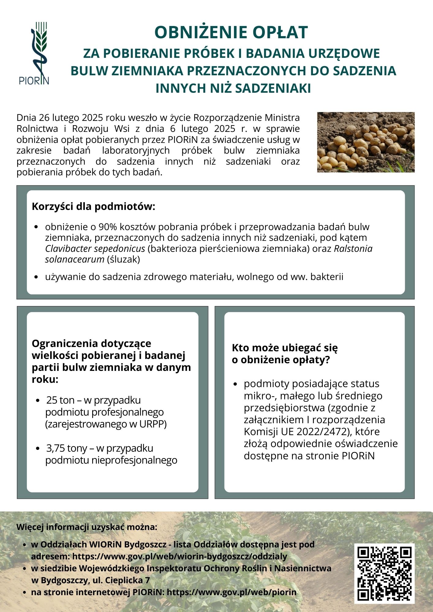 Ponadto w dniu 11 lutego 2025 r. zostało ogłoszone w Dzienniku Ustaw Rzeczypospolitej Polskiej Rozporządzenie Ministra Rolnictwa i Rozwoju Wsi z dnia 6 lutego 2025 r. w sprawie obniżenia opłat pobieranych przez Państwową Inspekcję Ochrony Roślin i Nasiennictwa za świadczenie usług w zakresie badań laboratoryjnych próbek bulw ziemniaka przeznaczonych do sadzenia innych niż sadzeniaki oraz pobierania próbek do tych badań (Dziennik Ustaw 2025 r. poz. 175).