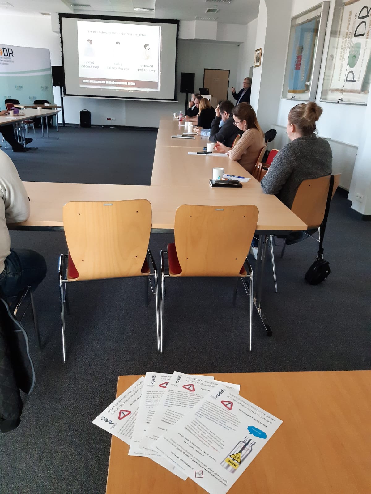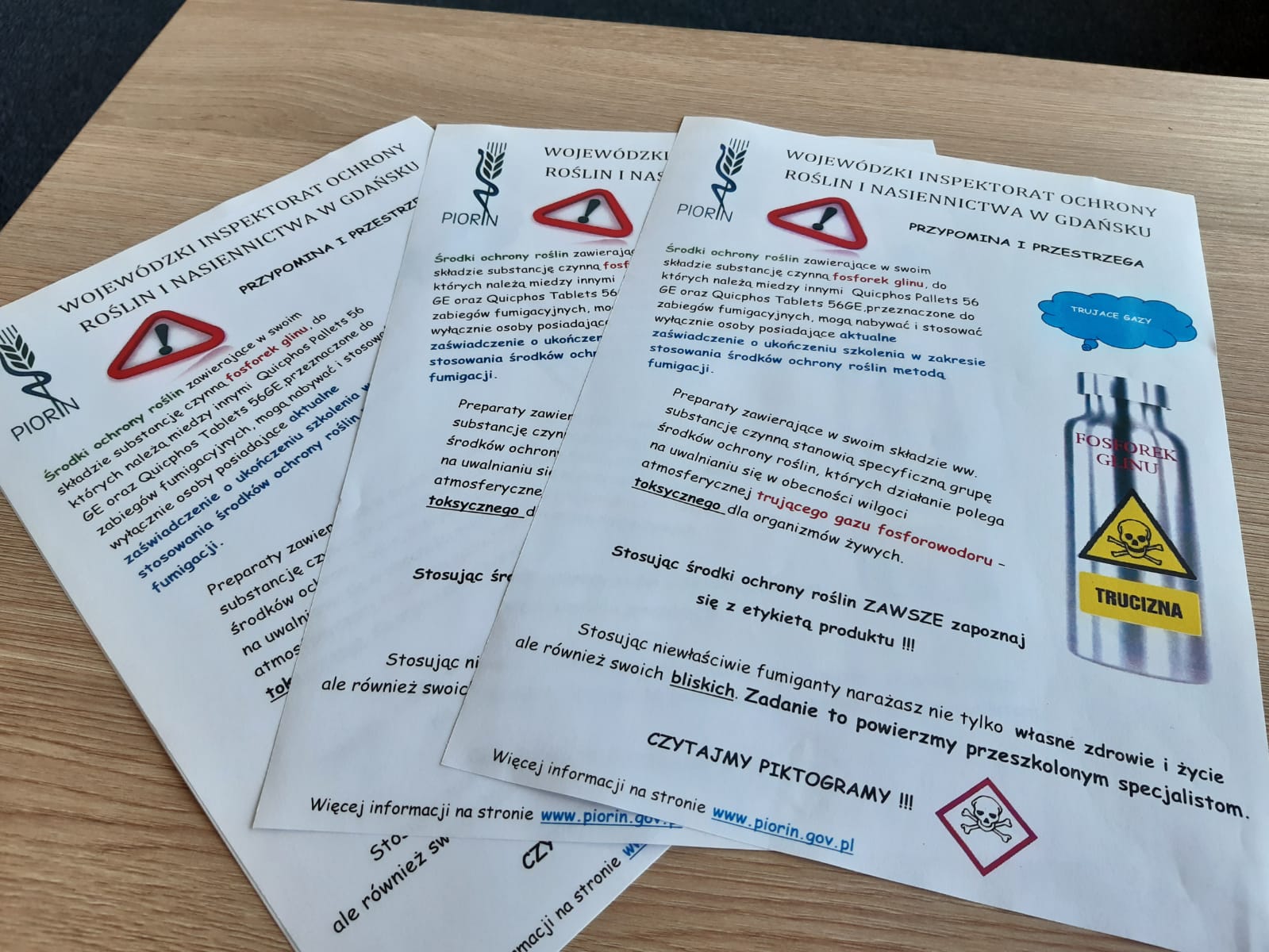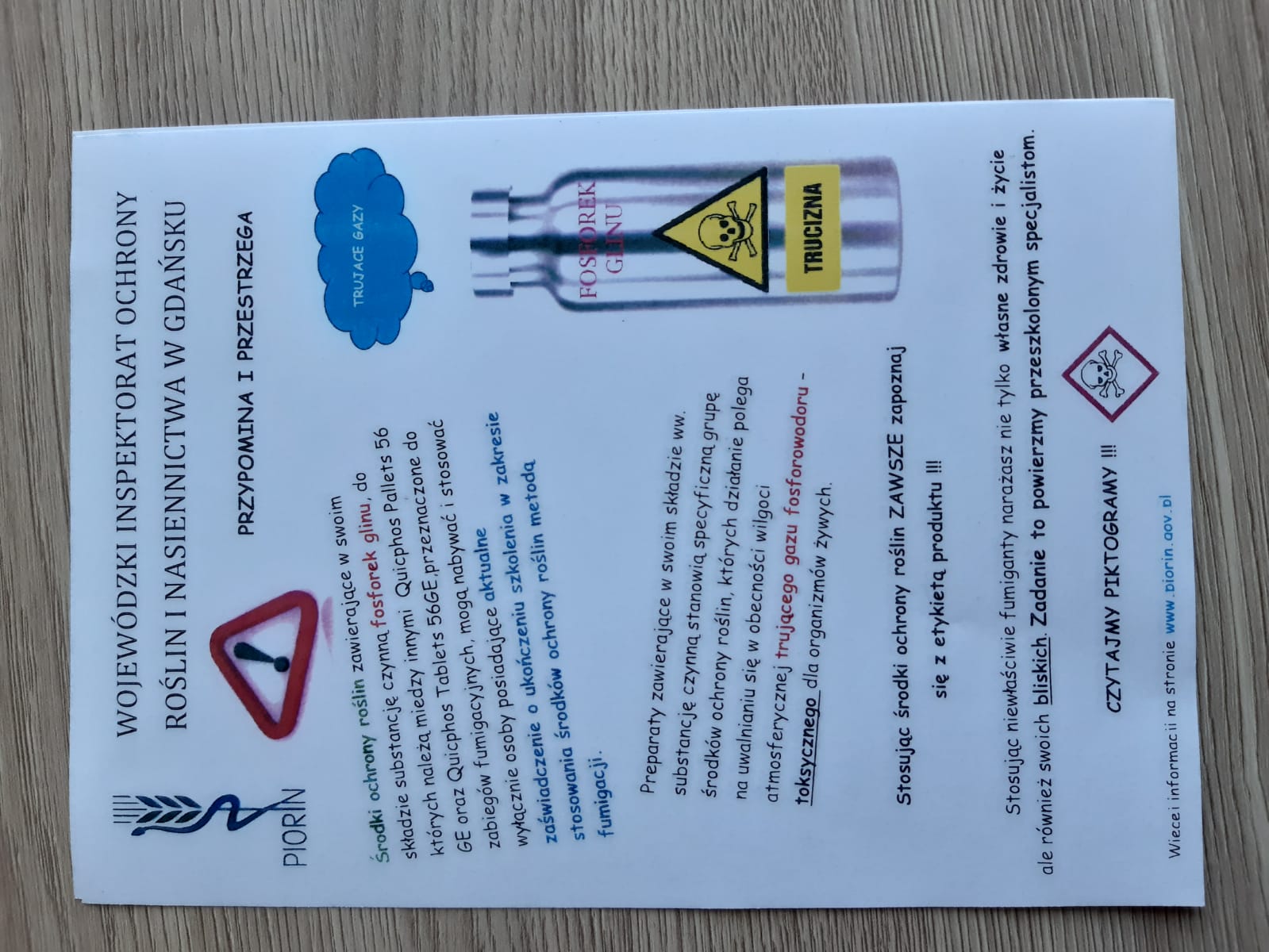 Słuchaczom szkolenia oraz prelegentom wręczono ulotki informacje dotyczące nabywania i stosowania środków ochrony roślin (toksycznych) zawierających w swym składzie fosforek glinu.