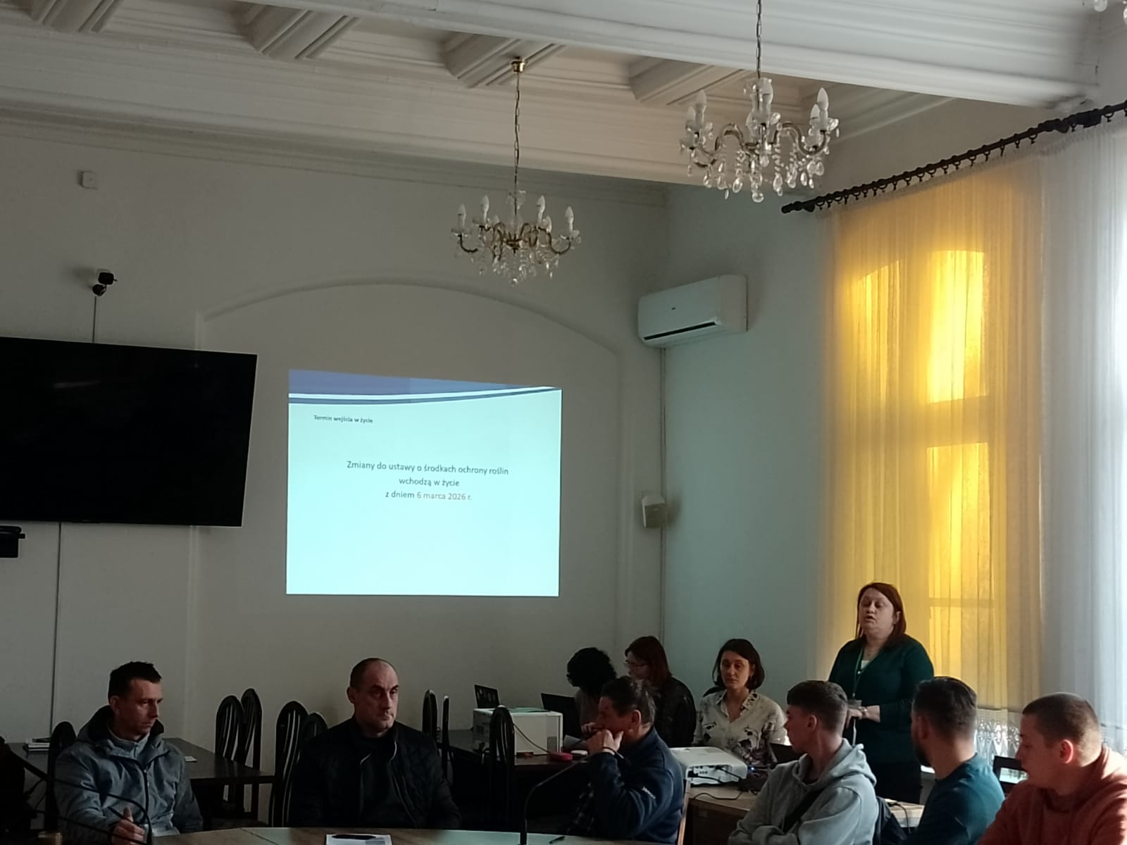 W dniu 26 lutego 2026 r., na zaproszenie Pomorskiego Ośrodka Doradztwa Rolniczego, przedstawiciele Oddziału w Kwidzynie przeprowadzili wykład poświęcony zmianom w ustawie o środkach ochrony roślin. Spotkanie odbyło się w Urzędzie Gminy w Kwidzynie w ramach szkolenia podstawowego z zakresu stosowania środków ochrony roślin sprzętem naziemnym, z wyłączeniem sprzętu montowanego na pojazdach szynowych oraz innego sprzętu stosowanego w kolejnictwie. Głównym celem wystąpienia było zapoznanie uczestników szkolenia z najnowszymi wymaganiami prawnymi, które w istotny sposób wpływają na codzienną praktykę rolniczą oraz obrót preparatami chemicznymi.