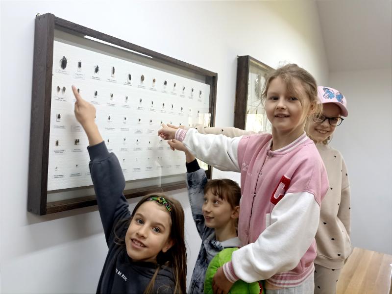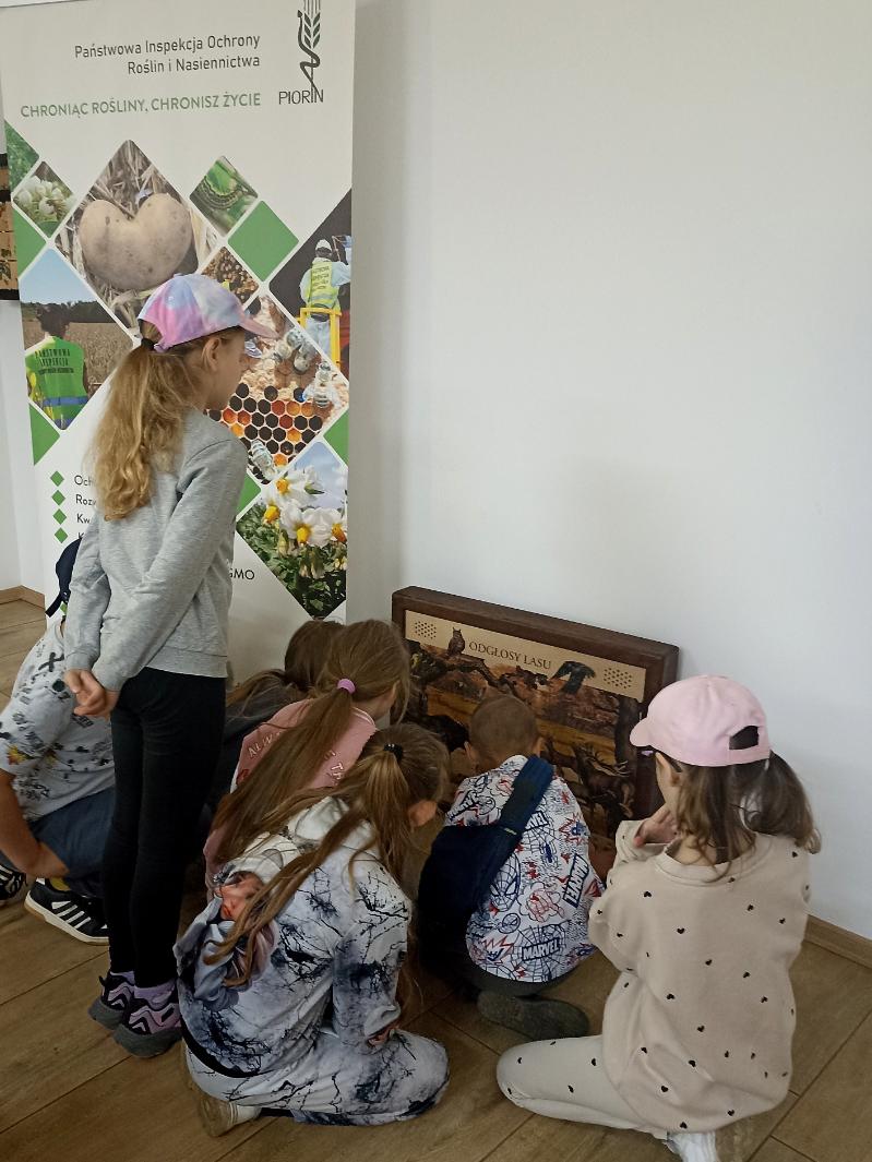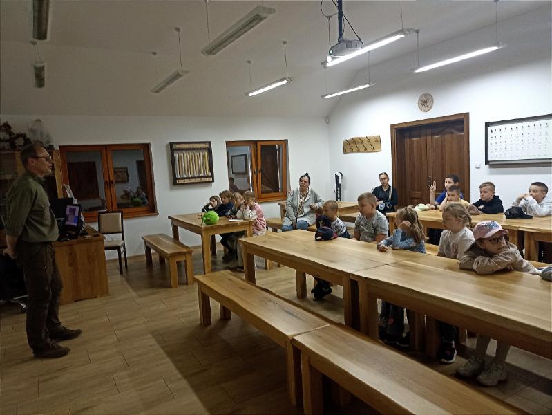 Na miejscu Pan Leśniczy Mariusz Bork zaprosił wszystkich do sali edukacyjnej, gdzie za pomocą prezentacji multimedialnej z wielką pasją opowiedział o faunie i florze lasu oraz o fascynującej pracy leśników. Uczestnicy poznali m.in. budowę i rodzaje lasu, dowiedzieli się, że drzewo tworzy ekosystem, czyli zbiór współzależnych organizmów: ptaków, owadów, grzybów, roślin runa, wody, gleby i środowiska, w którym te organizmy żyją. Uczniowie nauczyli się odróżniać jelenie od saren, obejrzeli zdjęcia innych mieszkańców lasu, posłuchali ich odgłosów oraz mieli okazję obejrzeć tablice z zasuszonymi roślinami i owadami.
