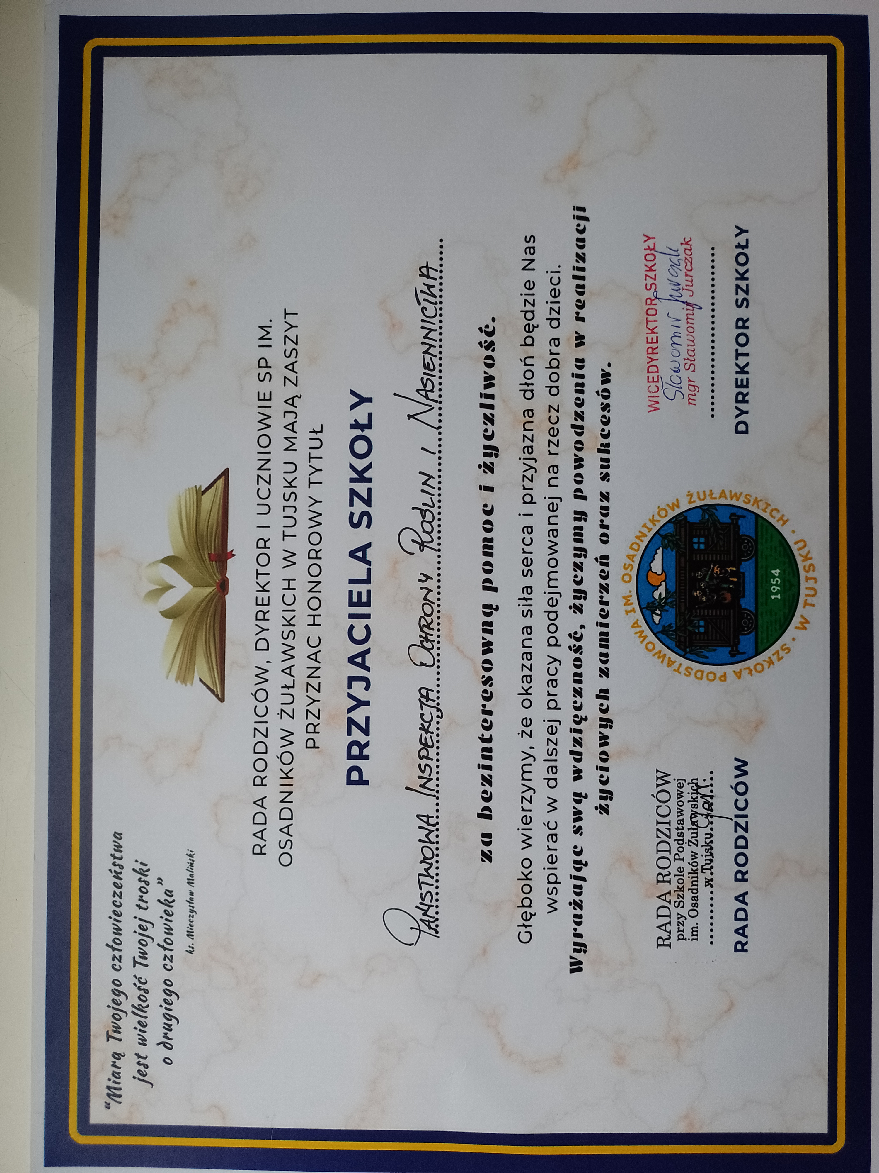 Nasze starania i serce wkładane w organizacje lekcji i stoiska zostały nagrodzone przyznaniem nam honorowego tytułu Przyjaciela Szkoły.