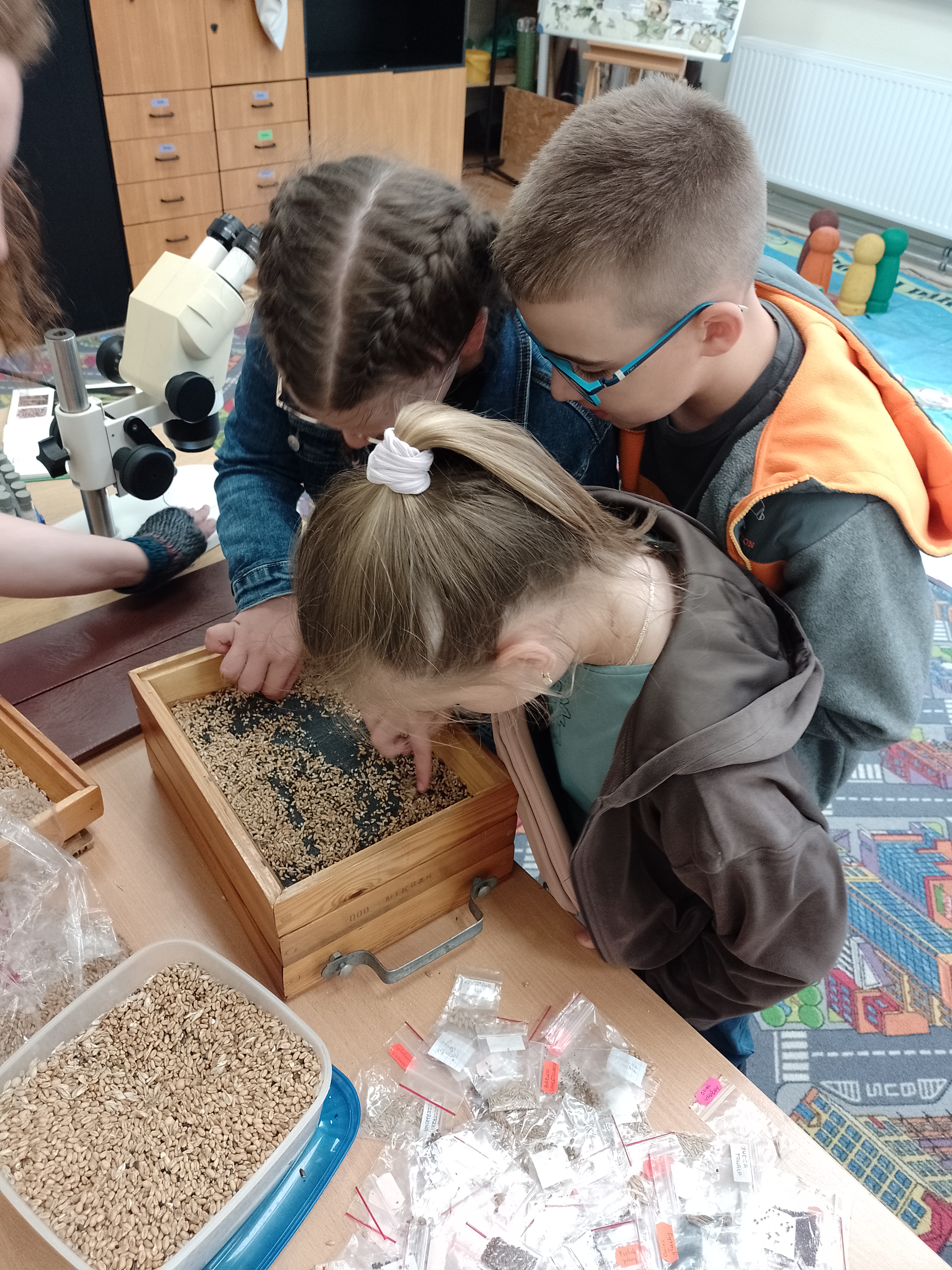 - pooglądać i porównać nasiona roślin uprawnych i chwastów pod binokularem dzięki czemu odkryli rozmaitość struktur i form kryjących się na ich powierzchni;