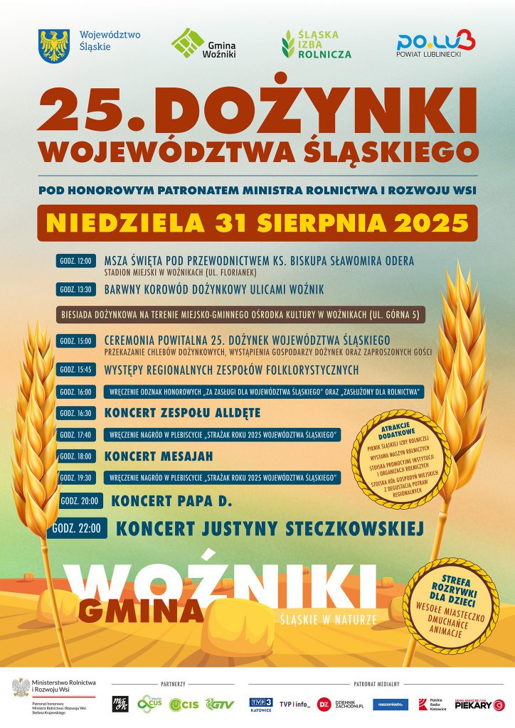 Uroczystości dożynkowe rozpoczną się mszą świętą dziękczynną, po której ulicami Woźnik przejdzie barwny i widowiskowy korowód dożynkowy. Na gości czekać będą regionalne stoiska Kół Gospodyń Wiejskich, prezentacje artystyczne, wystawa maszyn i urządzeń rolniczych, a także piknik Śląskiej Izby Rolniczej.
