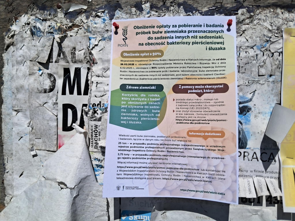 Od dnia 26.02.2025 profesjonalni producenci ziemniaków zarejestrowani w Urzędowym Rejestrze Podmiotów Profesjonalnych prowadzonym przez Świętokrzyskiego Inspektora Ochrony Roślin i Nasiennictwa mogą skorzystać z obniżenia o 90 % opłaty za pobranie prób i badania laboratoryjne ziemniaków, którymi planują obsadzić swoje plantacje. W danym roku jeden podmiot profesjonalny może przebadać do 25 ton ziemniaków pod kątem wystąpienia w nich Clavibacter sepedonicus oraz Ralstonia solonacearum. Z pomocy mogą również skorzystać nieprofesjonalni producenci ziemniaków (niezarejestrowani w URPP, uprawiający ziemniaki na własne potrzeby). Takie podmioty jednorocznie mogą przebadać po obniżonych opłatach 3,75 tony ziemniaków, które planują wykorzystać do obsadzenia swoich upraw.