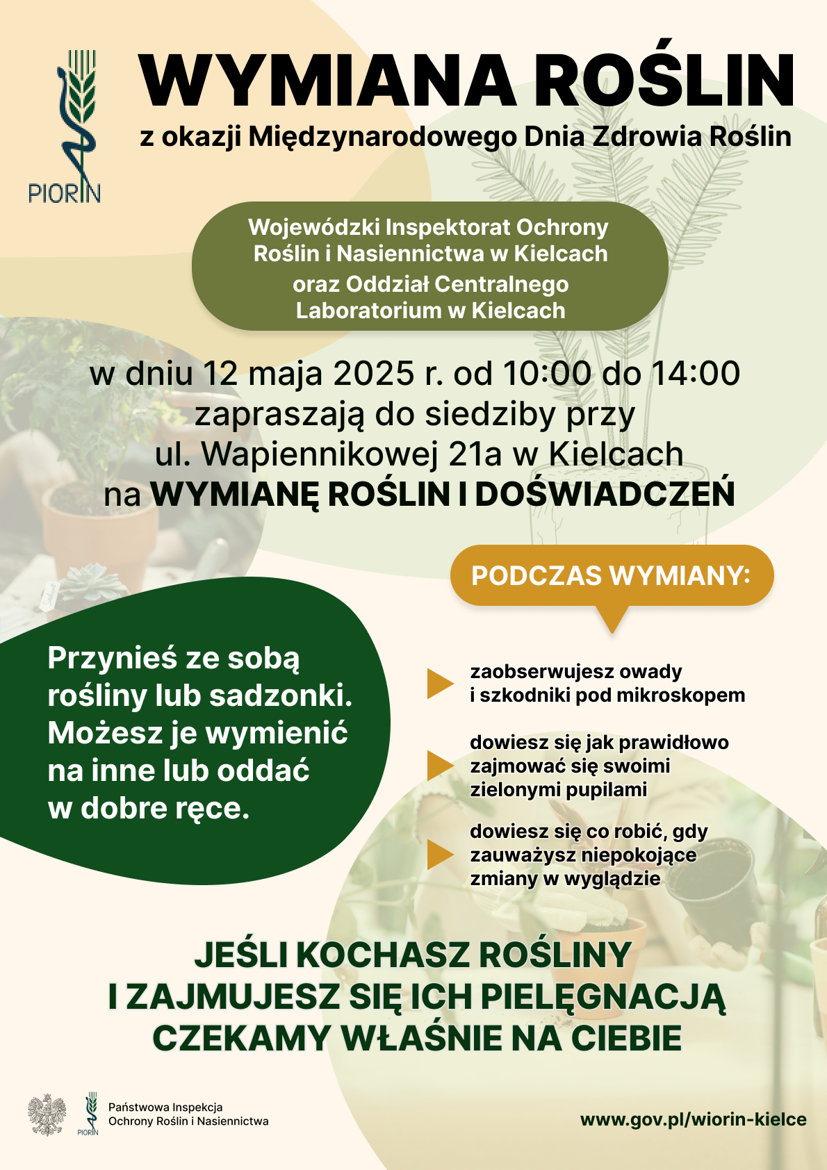 W ramach obchodów Międzynarodowego Dnia Zdrowia Roślin -12 maja 2025 r. Wojewódzki Inspektorat Ochrony Roślin i Nasiennictwa w Kielcach zaprasza na wymianę roślin i doświadczeń. Zainteresowani mogą przynieść ze sobą rośliny i sadzonki aby wymienić je na inne bądź też oddać w dobre ręce. Będzie można zaobserwować owady i szkodniki pod mikroskopem, dowiedzieć się jak prawidłowo zajmować się roślinami oraz co robić, gdy zauważy się niepokojące zmiany w wyglądzie roślin.