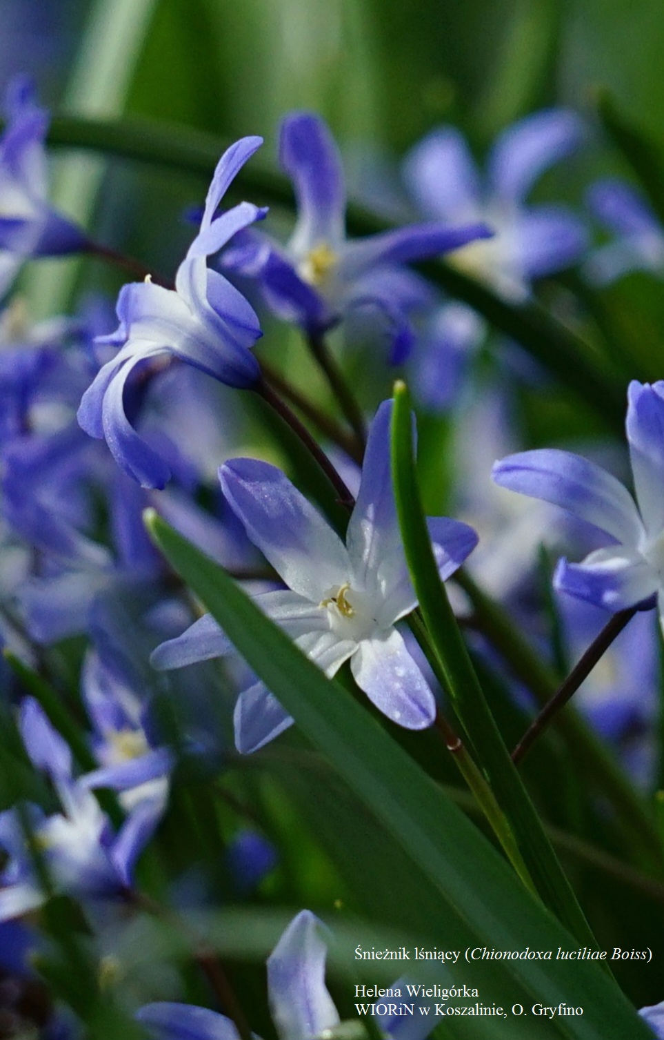 Wiosna to odpowiedni czas aby rozejrzeć się wokół i zachwycić budzącą do życia przyrodą. Cieplejsze i dłuższe dni sprzyjają wędrówkom. Mamy więcej możliwości bliższego przyjrzenia się wszystkiemu „co w trawie kwitnie”, bo to czas roślin kwitnących najbliżej ziemi, zwłaszcza w lesie. Spacerując po lesie możemy trafić na łąkę niebiesko kwitnących kwiatów. Są to kwiaty śnieżnika lśniącego (Chionodoxa luciliae Boiss). Śnieżnik jest rośliną z rodziny szparagowatych. W warunkach naturalnych rośliny te spotykane są w Azji Mniejszej, w górskich rejonach Turcji, Krety i Cypru. Nazwa naukowa pochodzi od greckich słów: chion – śnieg i doxa – duma, sława. A zatem śnieżnik nie występuje naturalnie w naszym środowisku i często też uprawiany jest jako roślina ozdobna. Ponadto w lesie kwitną także inne barwne rośliny; są to między innymi zawilec żółty (Anemone ranunculoides L.), przylaszczka pospolita (Hepatica nobilis Mill.), miodunka ćma (Pulmonaria obscura Dumort.), ziarnopłon wiosenny, jaskier wiosenny, dawniej pszonka (Ficaria verna Huds.) i wiele innych. Jakie są to rośliny przekonacie się gdy wybierzecie się na spacer do lasu.