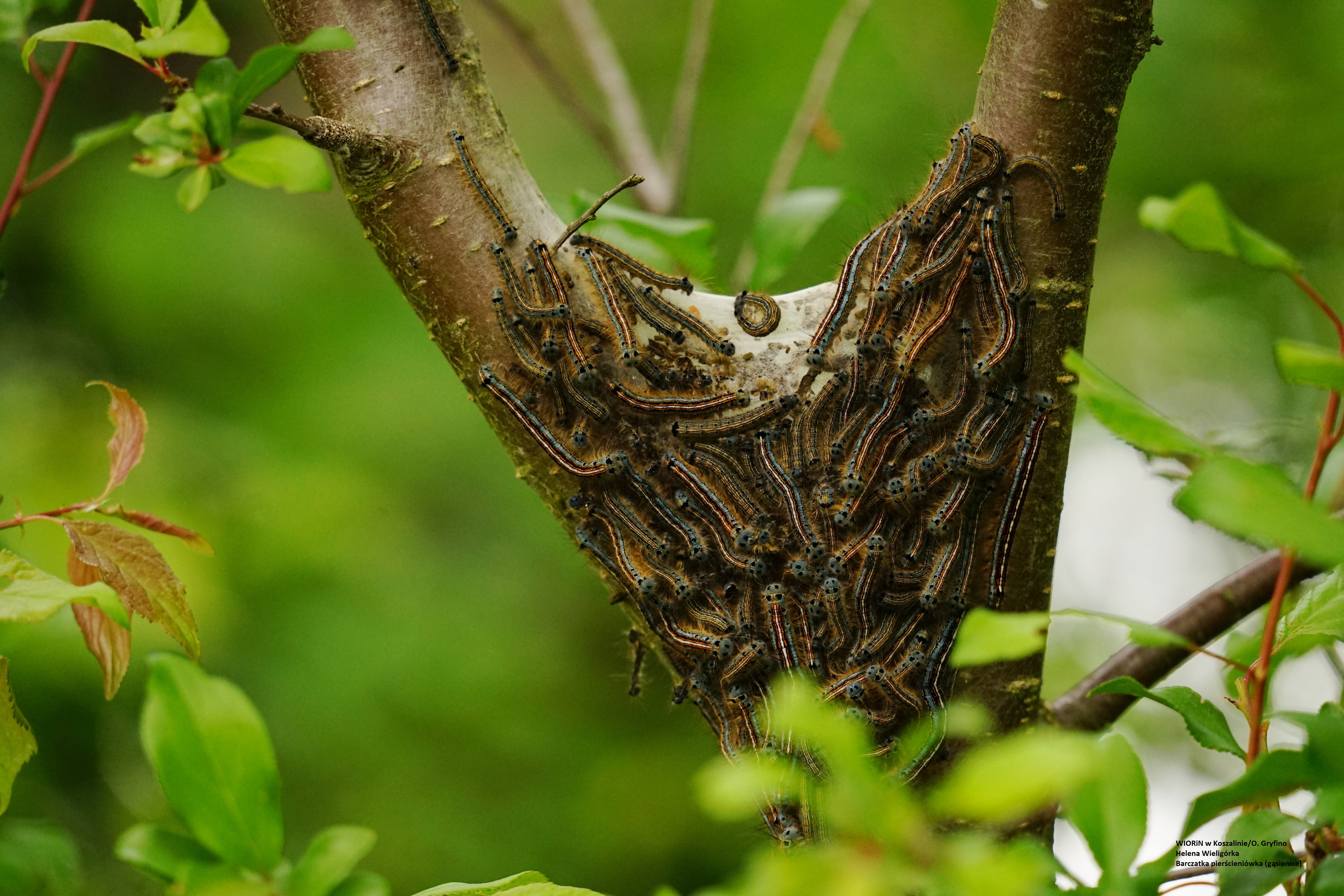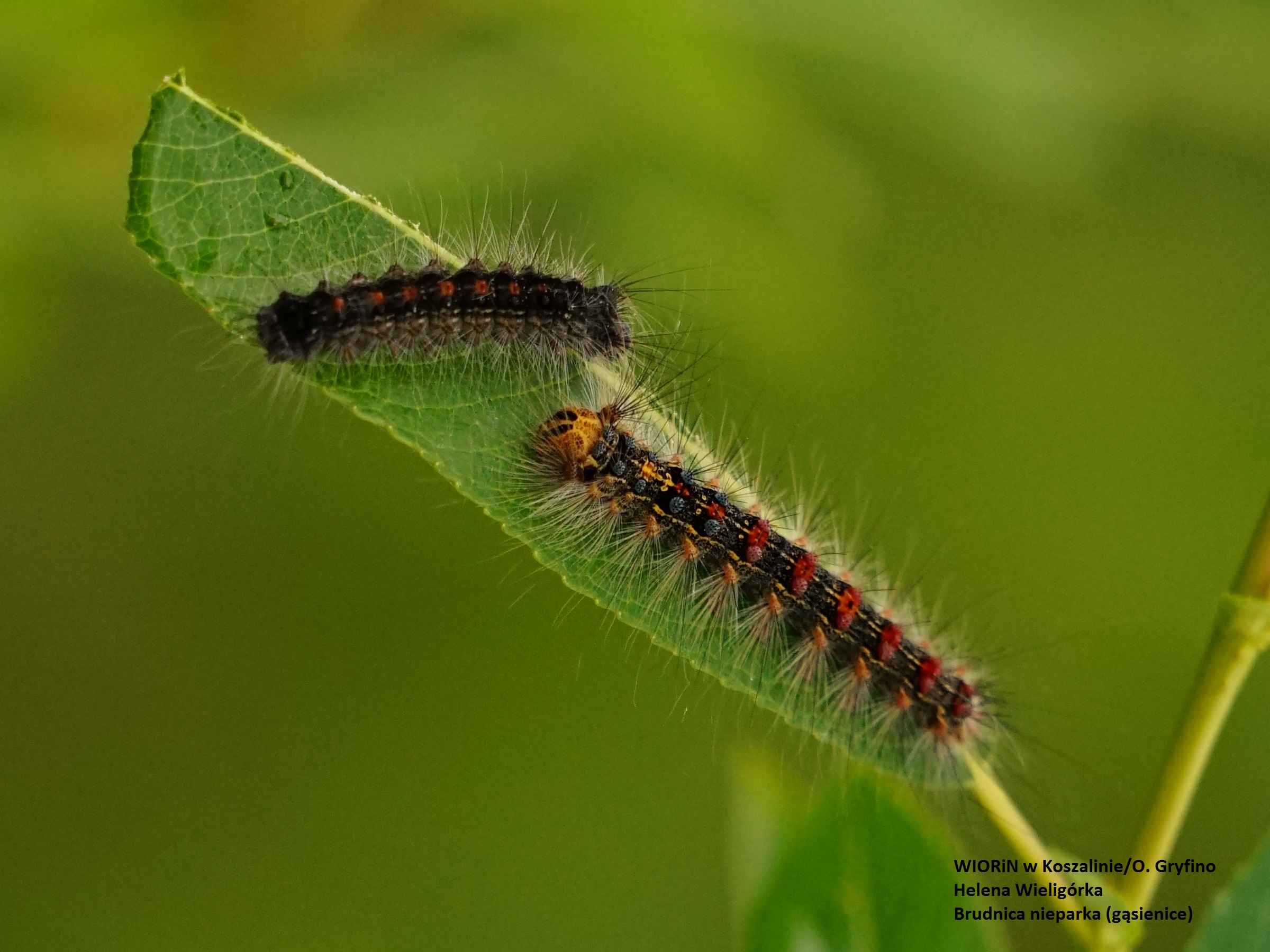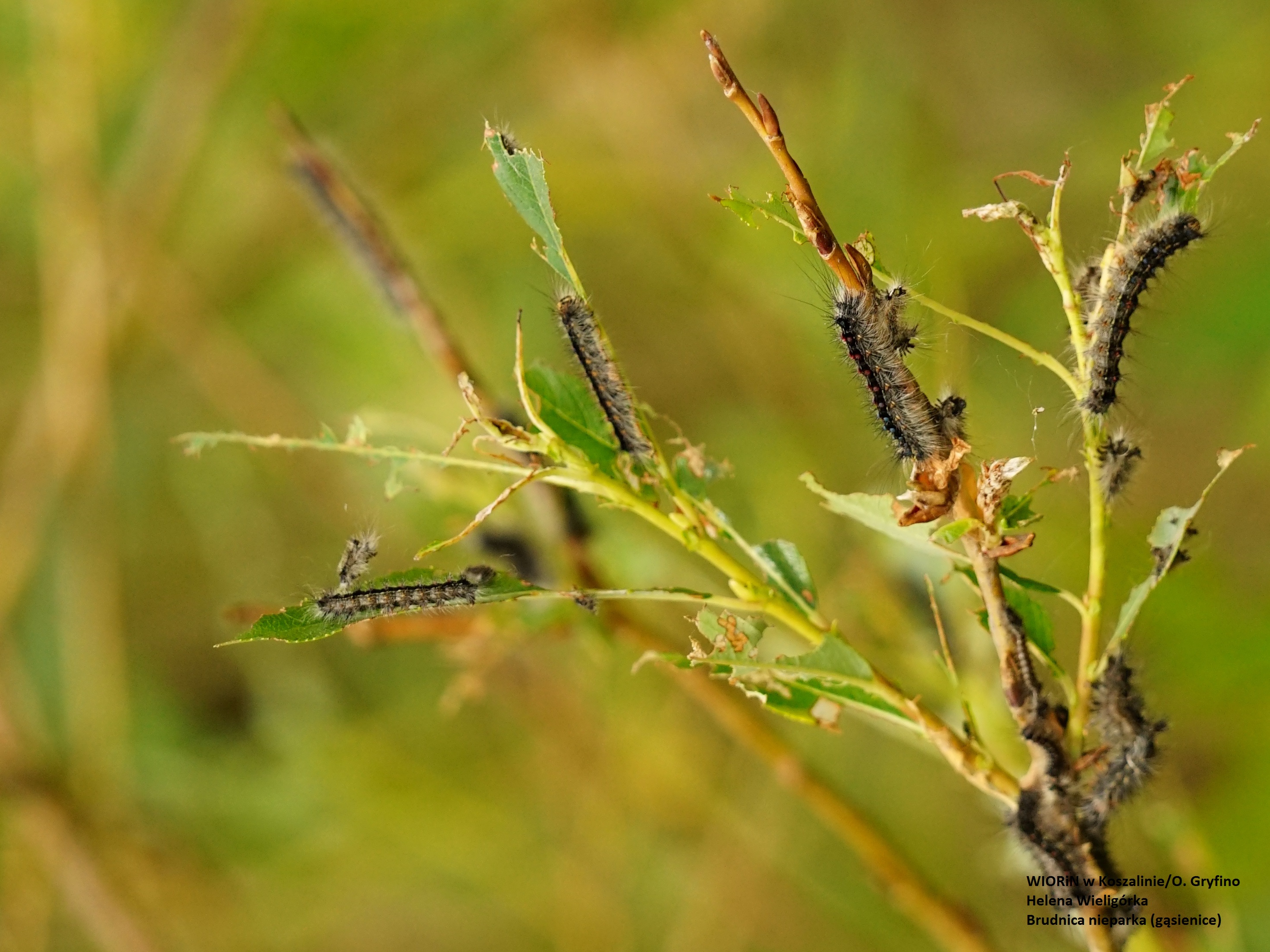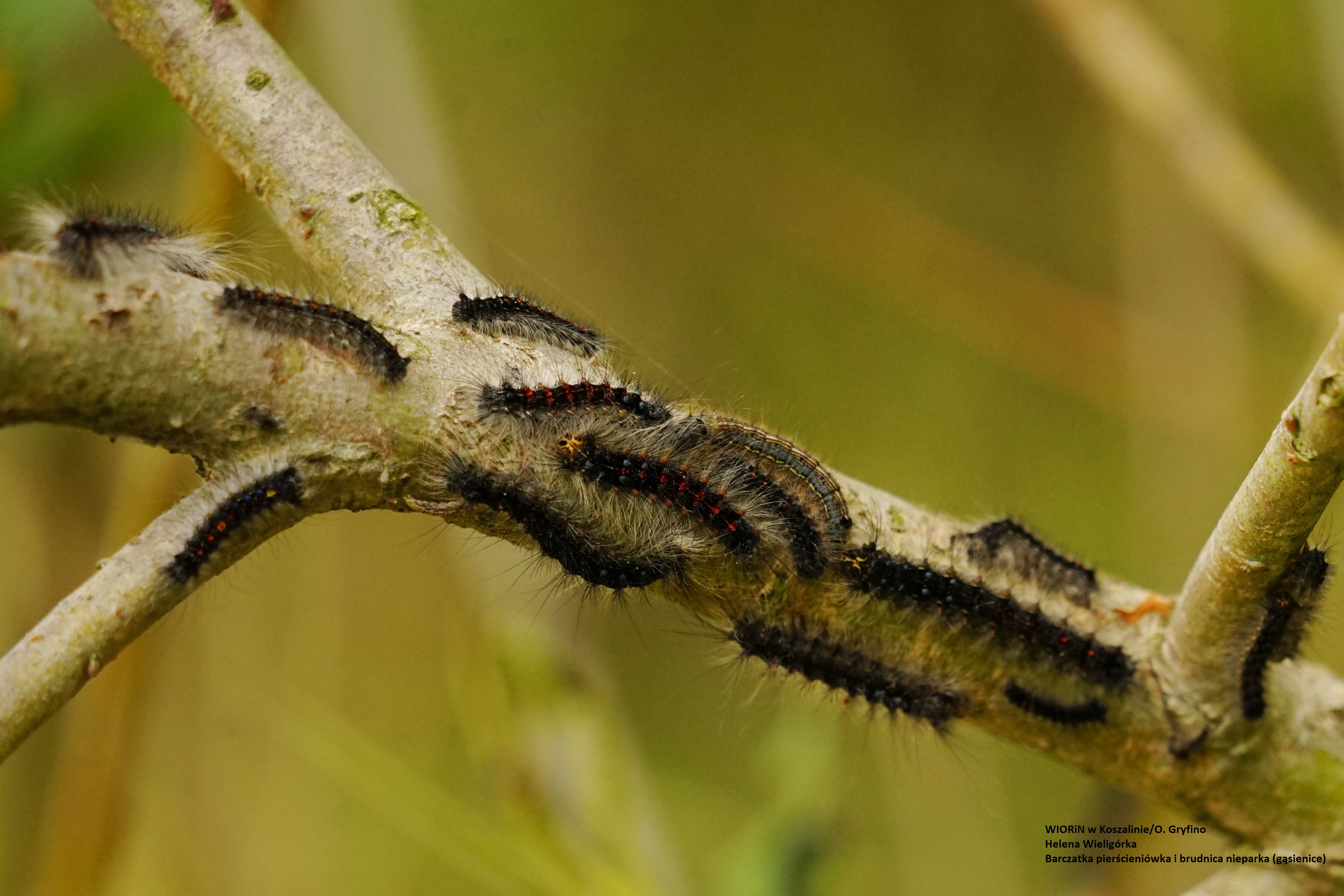 W maju na terenie działania Oddziału WIORiN w Gryfinie, w dolinie rzeki Odry, między Odrą Wschodnią a Odrą Zachodnią natrafiono na ognisko masowego żerowania gąsienic brudnicy nieparki oraz wylęg barczatki pierścieniówki. Gąsienice obu gatunków są polifagami i foliofagami; odżywiają się głównie liśćmi drzew liściastych. Gąsienice obserwowano na wierzbie, tarninie, dzikiej róży, chmielu i innych roślinach. Żerowanie dużej liczby owadów, głównie brudnicy nieparki, w niektórych przypadkach spowodowało prawie całkowite ogołocenie rośliny z liści, co prowadzi do jej osłabienia. Brudnica nieparka uważana jest za jednego z groźniejszych owadów dla gospodarki człowieka. Występuje bowiem w ogromnych gradacjach w południowej i wschodniej Europie, niszcząc drzewostany dębowe oraz sady. Spośród różnych gatunków żywicieli preferuje jednak dęby i drzewa owocowe. W Polsce największe szkody wyrządza okresowo, w odstępach kilkunastoletnich, w sadach i lasach liściastych z udziałem dębu, głównie we wschodniej części kraju. Żery prowadzą do znacznej utraty przyrostu, powstawania suchoczubów, a także pojawu szkodników wtórnych. Rozkładające się drewno dębu atakowane jest przez grzyby. Samica brudnicy nieparki (Lymantria dispar) składa 500 do 800 jaj w kilku złożach umieszczonych zwykle na pniach drzew. Żarłoczne gąsienice zaraz po wylęgu są czarne i silnie owłosione. Wyrośnięte osiągają długość nawet 70 mm. Na grzbiecie mają trzy żółte linie oraz guzikowate niebieskie opaski na pięciu pierwszych segmentach oraz rzędy czerwonych brodawek na dalszych. Co ciekawe, młode gąsienice, dzięki licznym włoskom, mogą być przenoszone przez wiatr (anemochoria). Na szczęście brudnica nieparka ma bardzo licznych wrogów naturalnych, którymi są pasożyty i ptaki.