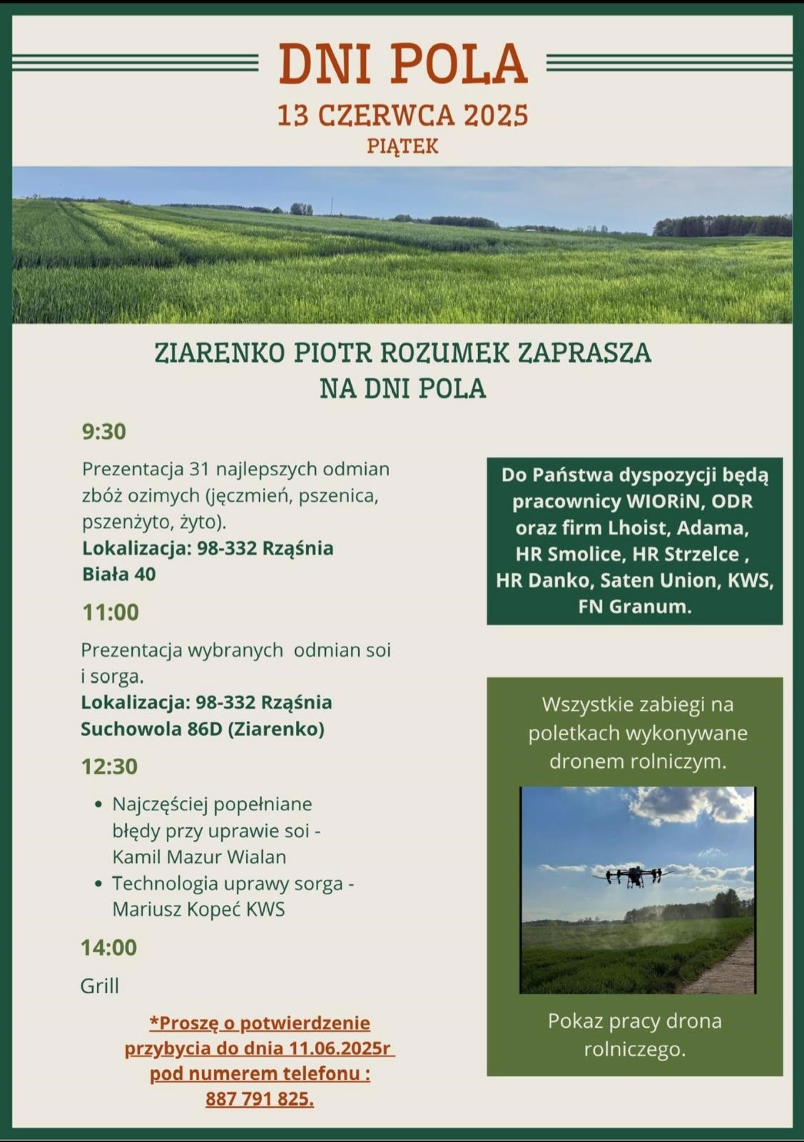 W dniu 13 czerwca 2025 roku w miejscowości Suchowola w gminie Rząśnia odbyły się DNI POLA zorganizowane przez Firmę ZIARENKO. Organizatorzy zaprezentowali poletka doświadczalne z kolekcją odmian roślin rolniczych uprawianych w różnych wariantach ochrony chemicznej. Wśród wielu firm i instytucji związanych z rolnictwem stoisko zorganizowali pracownicy WIORiN Łódź Oddział w Pajęcznie. Inspektorzy WIORiN udzielali informacji na temat zadań realizowanych przez Państwową Inspekcję Ochrony Roślin i Nasiennictwa, obowiązujących przepisów prawa oraz prawidłowości w stosowaniu środków ochrony roślin.