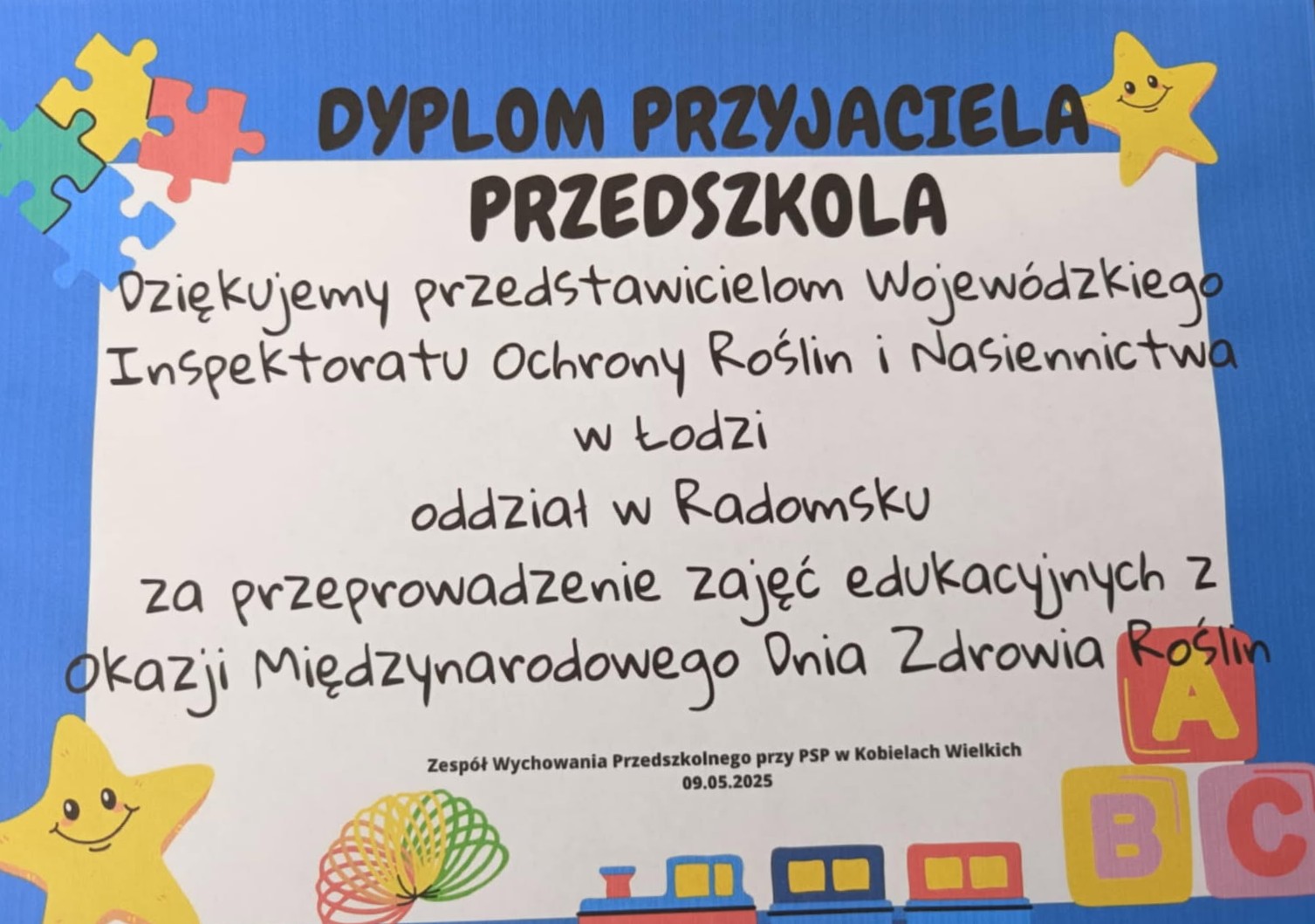 8 maja 2025 roku pracownicy Wojewódzkiego Inspektoratu Ochrony Roślin i Nasiennictwa w Łodzi Oddziału w Radomsku, w ramach obchodów Międzynarodowego Dnia Zdrowia Roślin, odwiedzili Publiczne Przedszkole w Kobielach Wielkich. W grupie dzieci 3-, 4- i 5-letnich przygotowali pogadankę na temat zadań wykonywanych przez Inspekcję oraz porozmawiali o roli owadów zapylających w uprawie roślin.