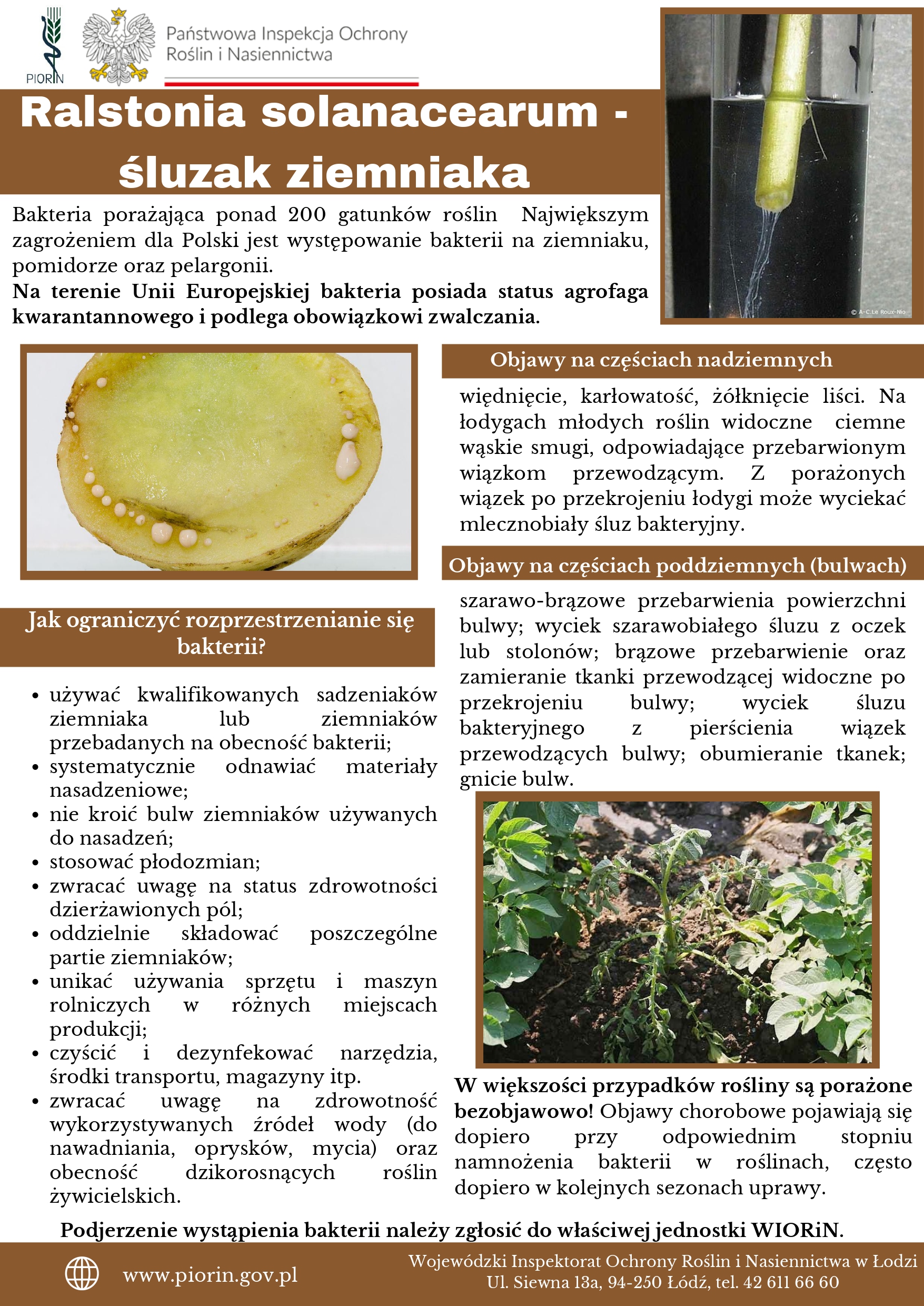 Szkodliwość Ralstonia solanacearum (śluzak) polega na szybkim rozprzestrzenianiu się szczególnie wraz ze skażoną wodą, która to z kolei wykorzystywana do nawadniania, zraszania, czy opryskiwania roślin, powinna być pobierana z ujęć nieporażonych. Bakteria najczęściej poraża rośliny z rodziny psiankowatych, a w szczególności rośliny pomidora i ziemniaka. Ralstonia solanacearum rozprzestrzenia się głównie poprzez zakażone bulwy ziemniaka, zainfekowane narzędzia, wody powierzchniowe oraz rośliny dzikorosnące z rodziny Solanaceae. Więcej informacji znajduje się w ulotce informacyjnej załączonej do artykułu.