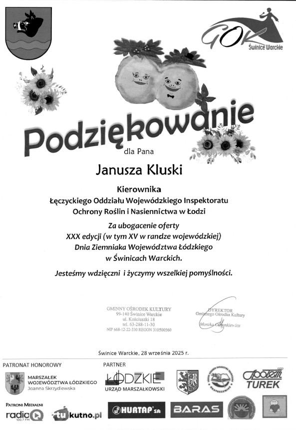 Podczas obchodów Wojewódzkiego Święta Dnia Ziemniaka w Świnicach Warckich w dniu 28 września 2025 roku inspektorzy WIORiN w Łodzi Oddział w Łęczycy promowali WIORiN w Łodzi Oddział w Łęczycy. Podczas promowania przekazywali producentom ziemniaka informacje dotyczace rejestracji paszportowania, zwalczania chorób i szkodników porażających plantacje ziemniaka.