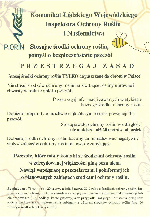 W trosce o ochronę pszczół oraz innych zapylaczy, które odgrywają kluczową rolę w zapylaniu roślin uprawnych, apelujemy do wszystkich użytkowników środków ochrony roślin o przestrzeganie zasad bezpieczeństwa. Ich stosowanie w sposób nieodpowiedzialny może prowadzić do poważnych zagrożeń dla zdrowia owadów zapylających, a tym samym – dla ekosystemu i jakości plonów.
