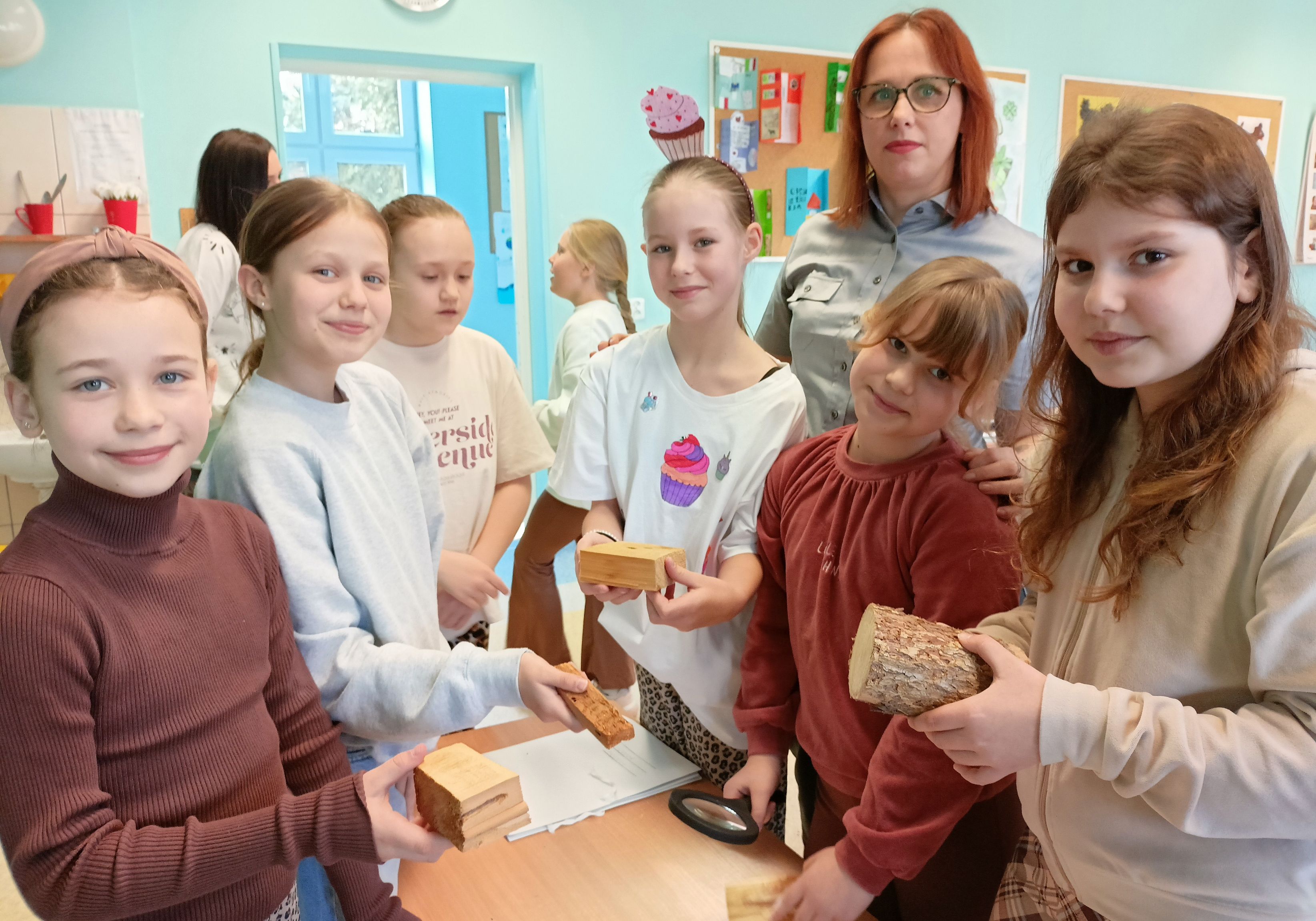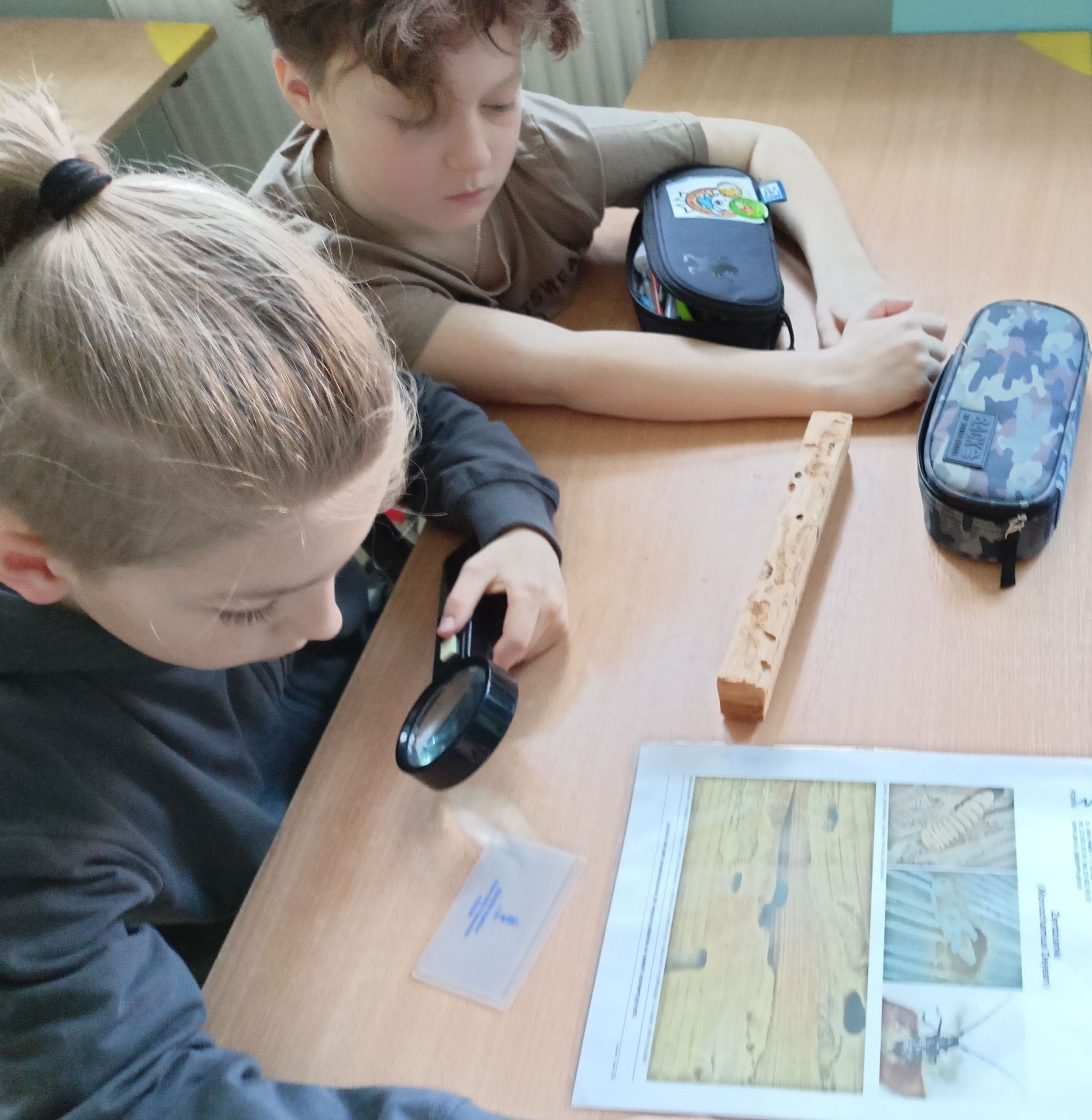 Zajęcia wzbogacone zostały o część praktyczną z użyciem podświetlanej lupy, dzięki której uczniowie z ogromnym zainteresowaniem oglądali w powiększeniu przyniesione przez inspektorów próbki drewna z widocznymi chodnikami larwalnymi.