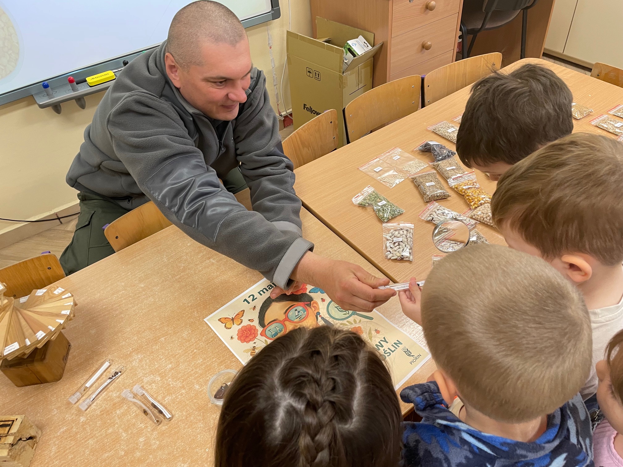 Podczas spotkania dzieci dowiedziały się, jak rozpoznać, że roślina jest chora oraz jak można jej pomóc. Szczególną atrakcją było oglądanie przez lupę prawdziwych szkodników roślin oraz oznak chorób na liściach i łodygach. Dzieci z wielkim zainteresowaniem przyglądały się szczegółom niewidocznym gołym okiem, ucząc się obserwacji i rozpoznawanie zagrożeń dla roślin.