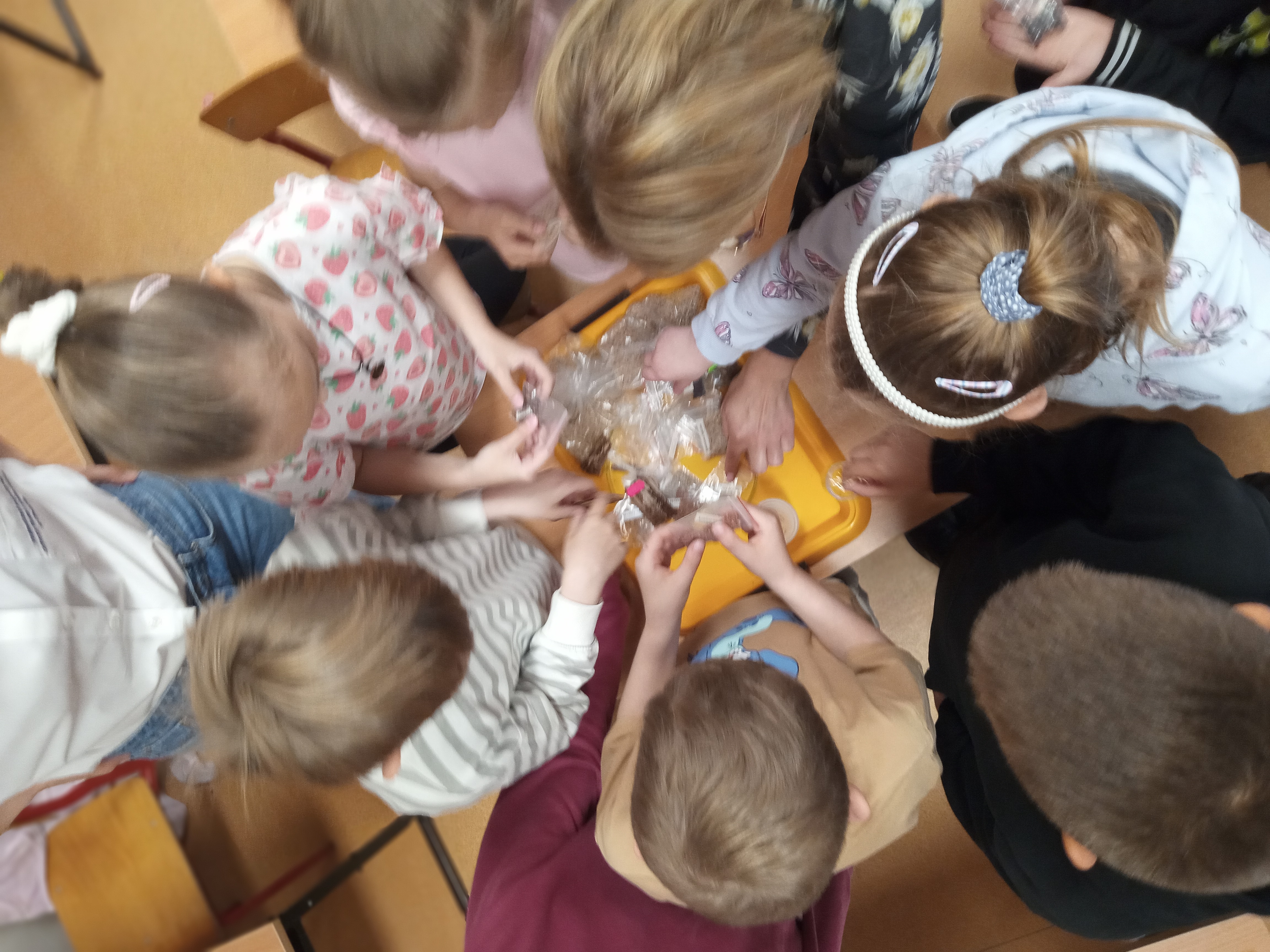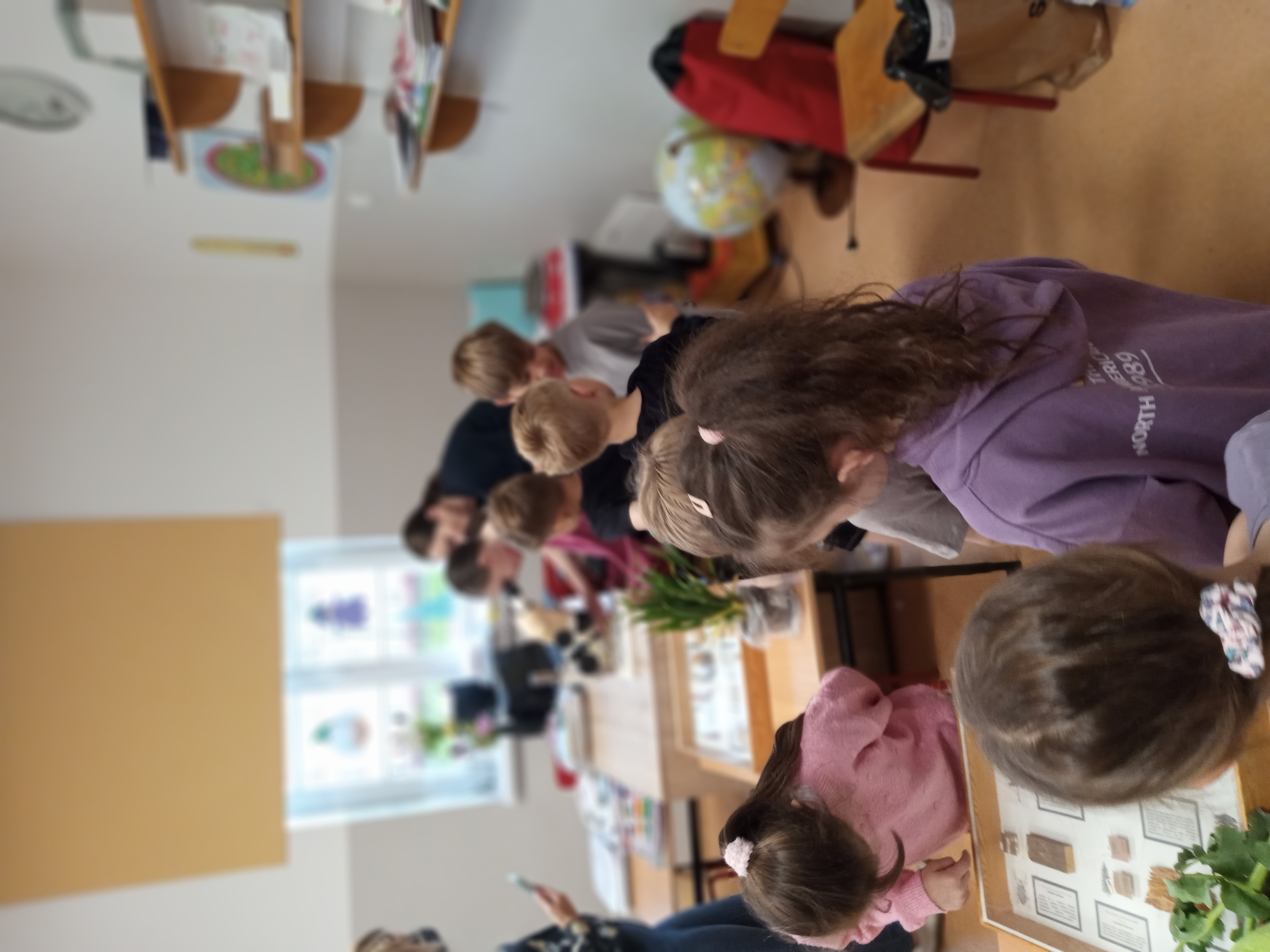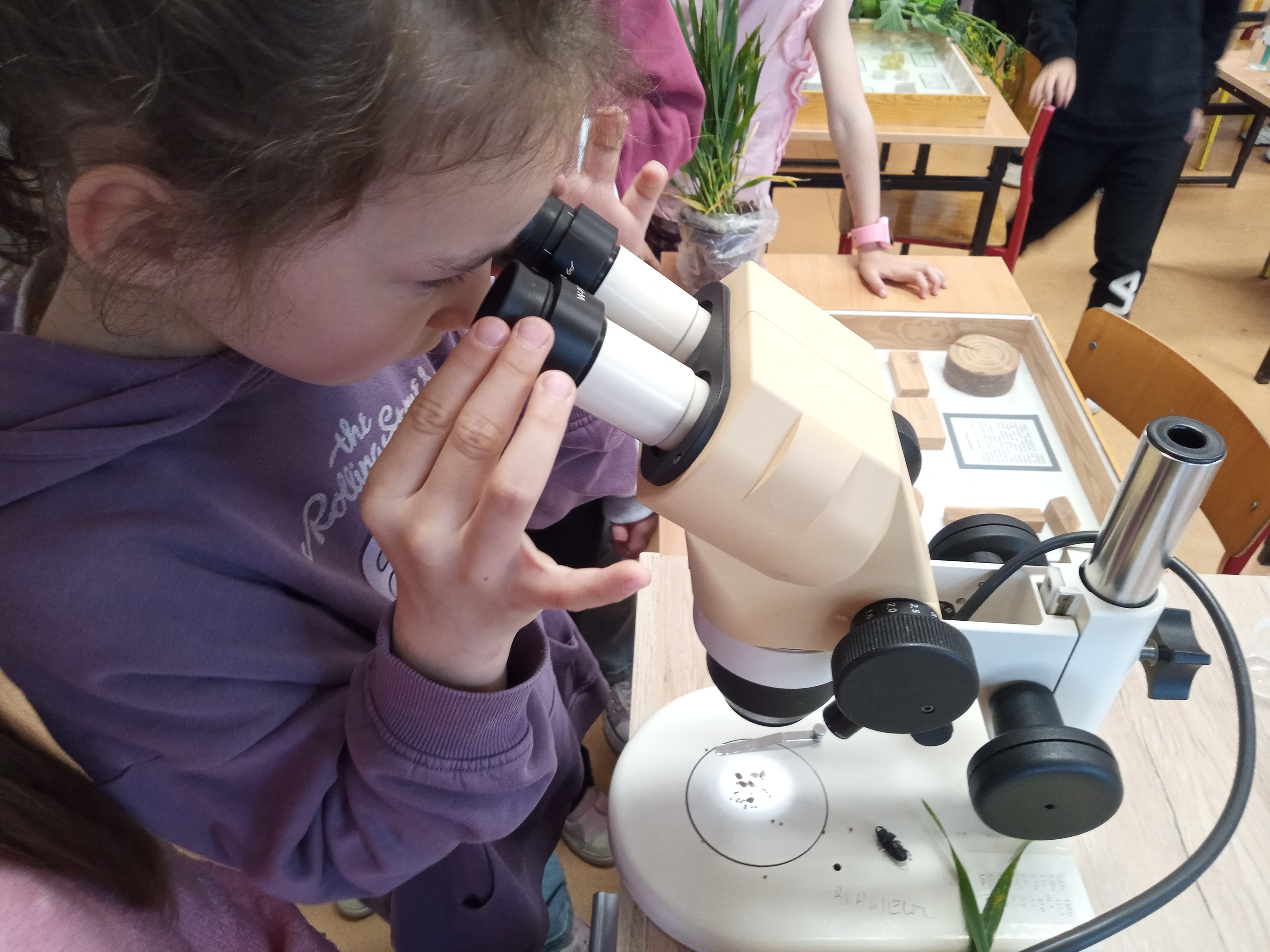 Największą atrakcją zajęć była możliwość oglądania próbek roślin, nasion oraz owadów pod binokularem. Dzieci były bardzo zaangażowane i chętnie uczestniczyły w zajęciach, zadawały pytania i dzieliły się swoimi obserwacjami oraz przygodami związanymi z przyrodą.