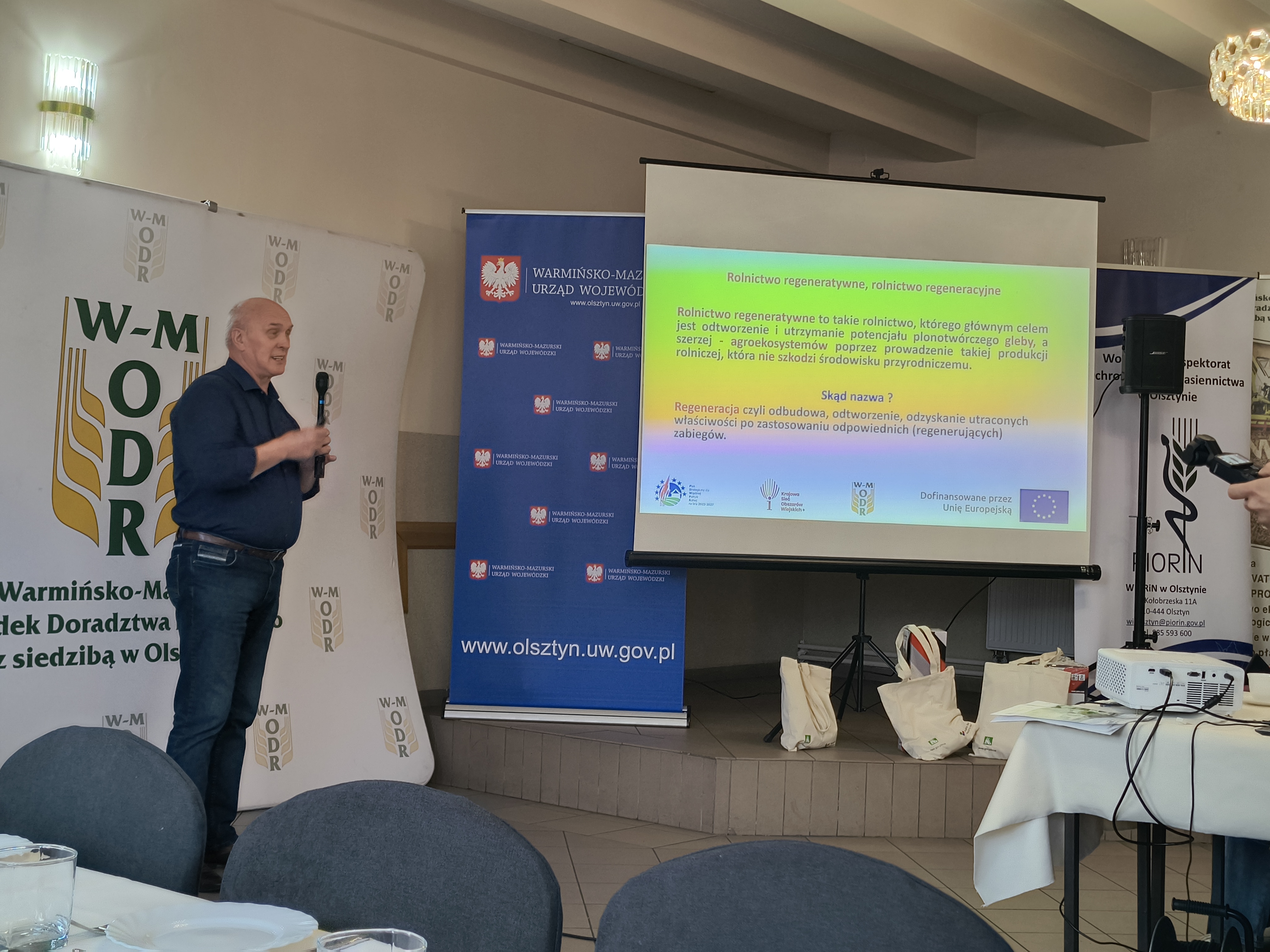 Po części warsztatowej na poletkach demonstracyjnych uczestnicy udali się na salę wykładową, gdzie został wygłoszony wykład pt.: „Rolnictwo regeneratywne - innowacja czy powrót do natury”. Prelekcja poprowadzona przez prof. dr hab. Marka Marksa, który przybliżył uczestnikom założenia tej nowoczesnej i zrównoważonej metody gospodarowania, skupiającej się na poprawie żyzności gleby, odbudowie bioróżnorodności i zwiększaniu odporności ekosystemów rolniczych przynoszących korzyści zarówno dla środowiska, jak i dla rolników.