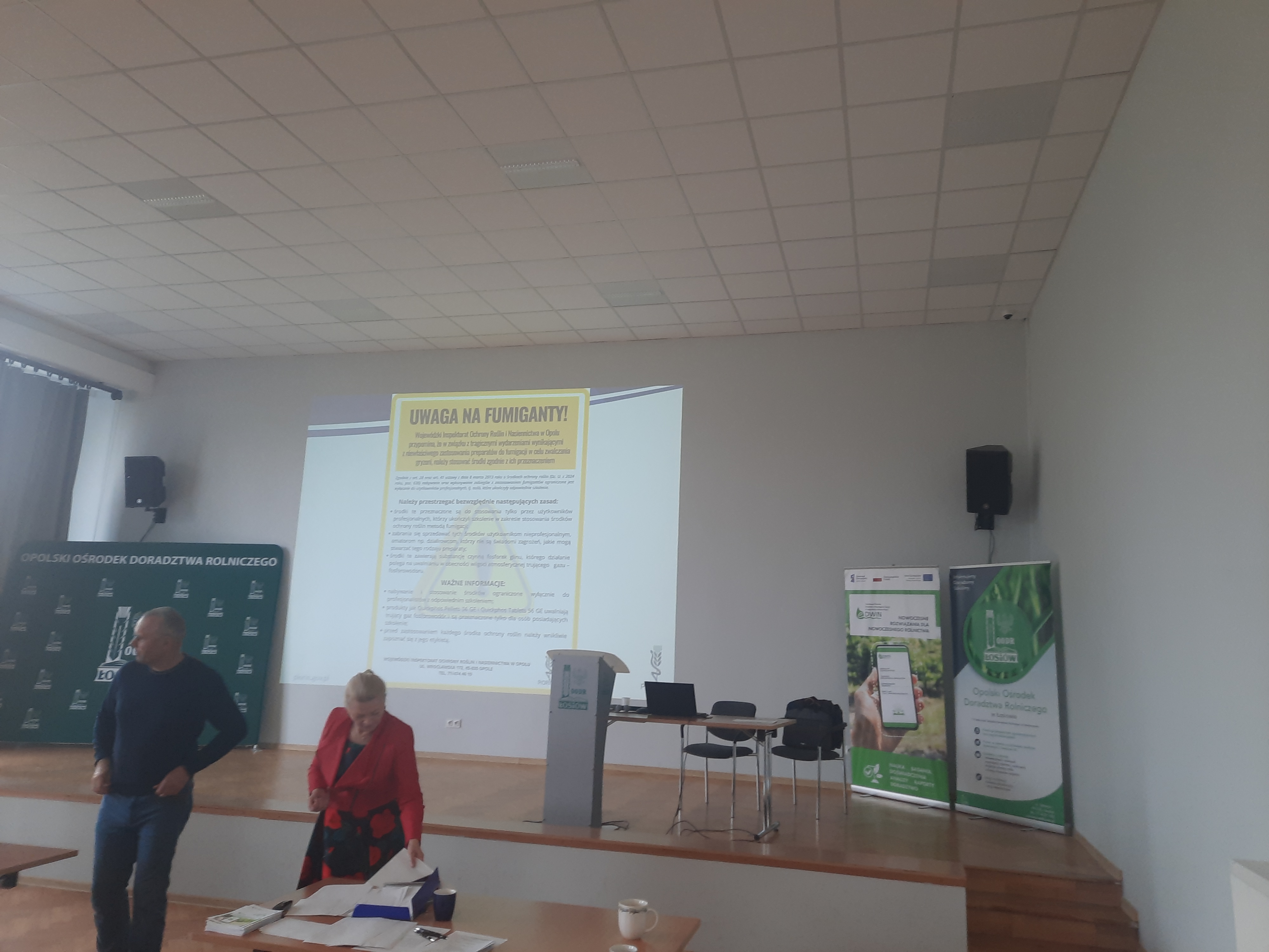 Podczas prezentacji omówiono m.in. zagrożenia związane ze zastosowaniem środków ochrony roślin zawierających fosforek glinu lub fosforek magnezu, zasady nabywania oraz stosowania tej grupy środków. Przypominano uczestnikom szkolenia o obowiązku wykonywania zabiegów z użyciem środków ochrony roślin sprzętem sprawnym technicznie tj. poddawanym okresowym badaniom technicznym. Ponadto zwrócono się do uczestników szkolenia o aktualizowanie posiadanego sprzętu do stosowania środków ochrony roślin i zgłaszanie tego pracownikom Oddziału Brzeg w miarę możliwości na bieżąco.