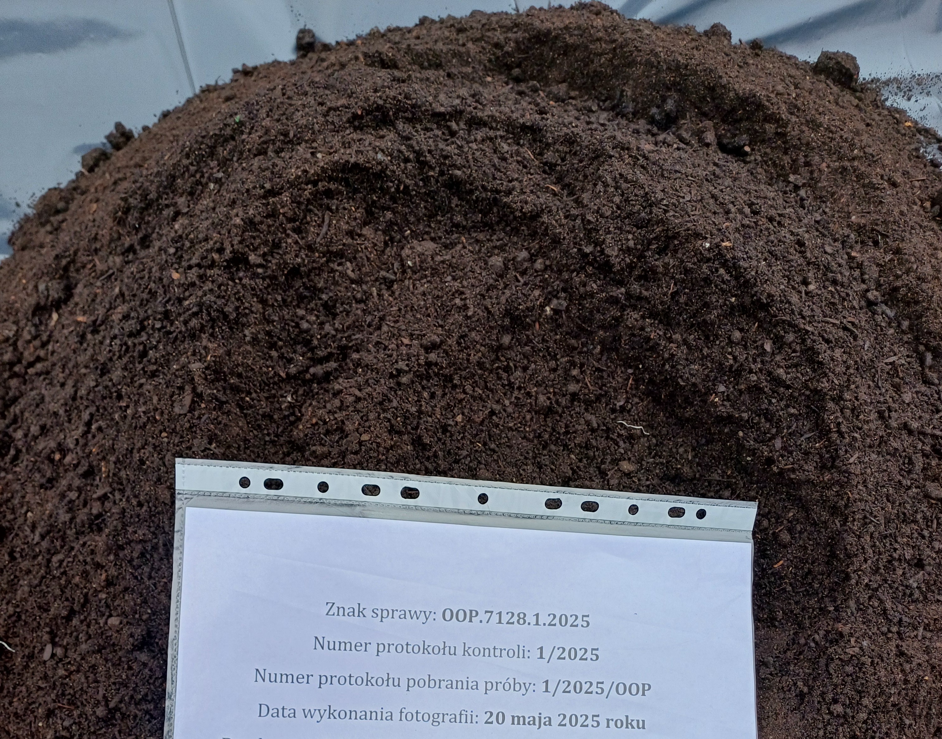 Organiczny środek poprawiający właściwości gleby powstaje w wyniku procesu kompostowania biodegradowalnych odpadów zielonych. Odpady te są rozdrabniane, a następnie formowane w pryzmy, w których zachodzi proces kompostowania. Po zakończeniu procesu frakcja organiczna jest przesiewana. W ramach prowadzonych czynności kontrolnych pobrano próbki do badań laboratoryjnych w celu sprawdzenia produktu w zakresie wymagań jakościowych określonych w decyzji Ministra Rolnictwa i Rozwoju Wsi, które deklaruje producent oraz w zakresie wymagań wynikających z rozporządzenia Ministra Rolnictwa i Rozwoju Wsi z dnia 9 sierpnia 2024 roku w sprawie wykonania niektórych przepisów ustawy o nawozach i nawożeniu w zakresie zawartości zanieczyszczeń metalami ciężkimi, a także na obecność żywych jaj pasożytów jelitowych Ascaris sp., Trichuris sp. Toxocara sp. oraz bakterii z rodzaju Salmonella.