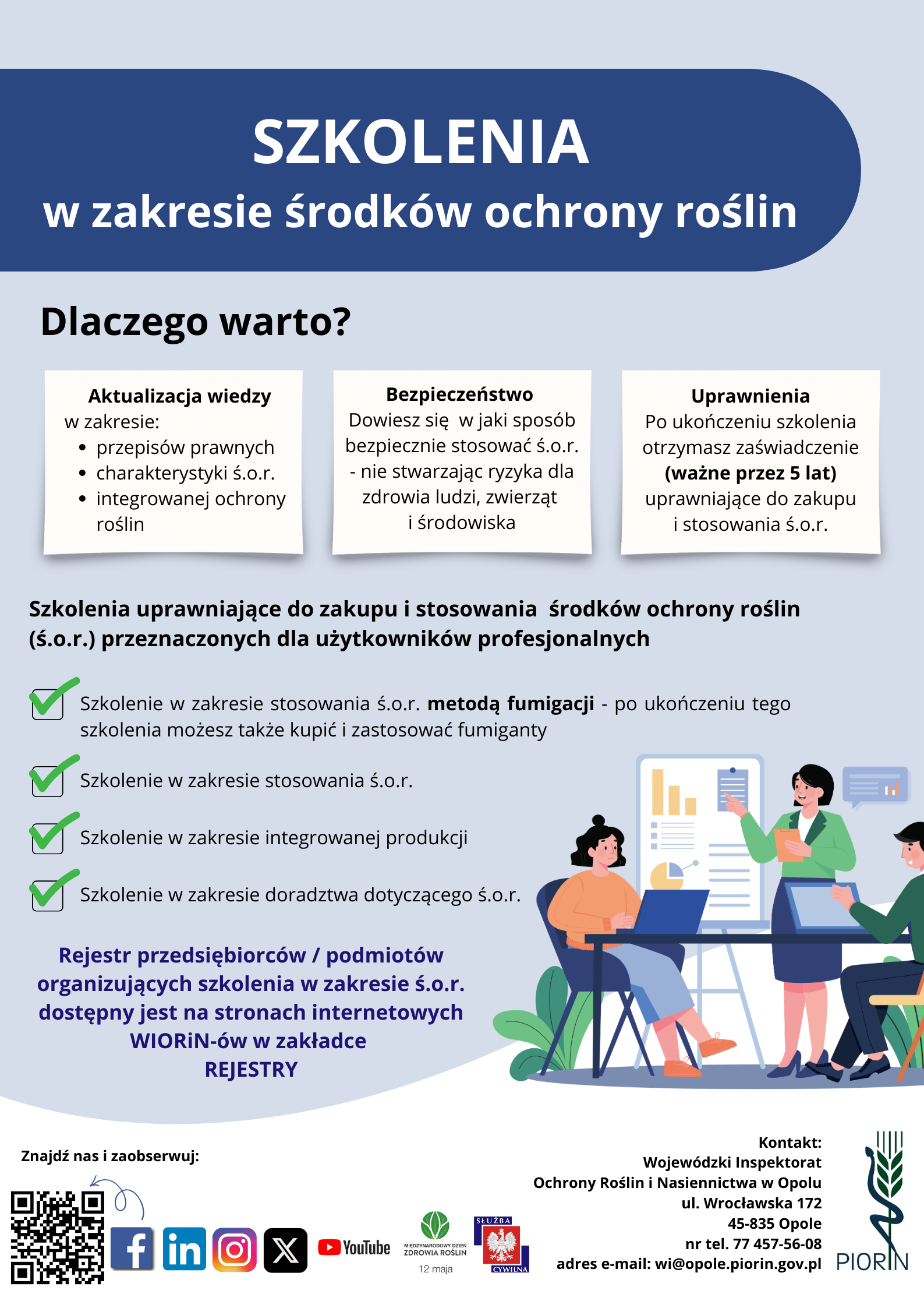Wojewódzki Inspektorat Ochrony Roślin i Nasiennictwa w Opolu przypomina o obowiązku posiadania aktualnego szkolenia w zakresie stosowania środków ochrony roślin przez użytkowników profesjonalnych.