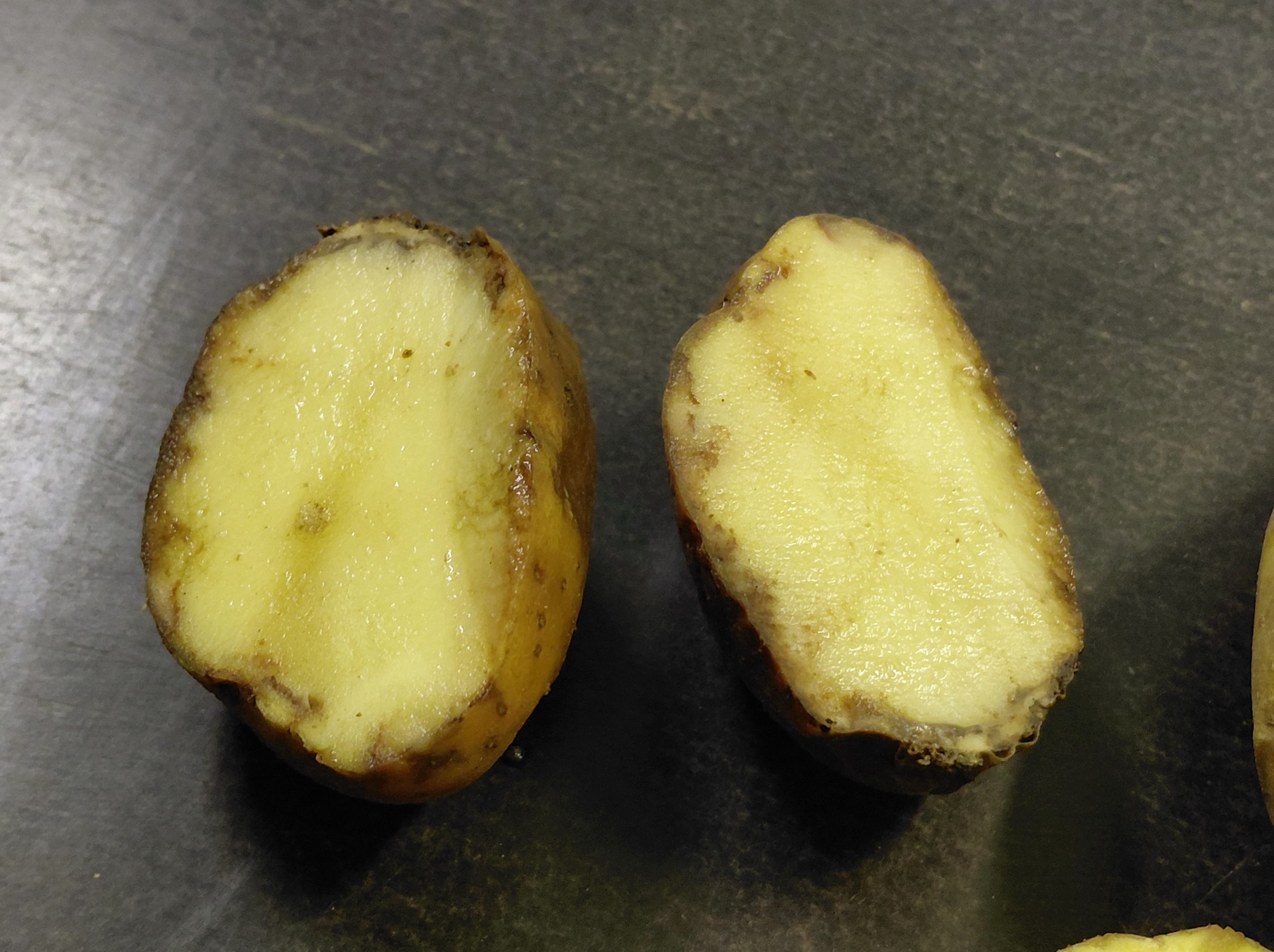 Druga część szkolenia dotyczyła oceny cech zewnętrznych bulw ziemniaka. Uczestnicy uczyli się rozpoznawać objawy chorób i uszkodzeń, mierzyć kalibraż bulw, a także oceniać jednorodność i ogólną jakość materiału. W części praktycznej porównywano bulwy zdrowe z egzemplarzami wykazującymi charakterystyczne nieprawidłowości.
