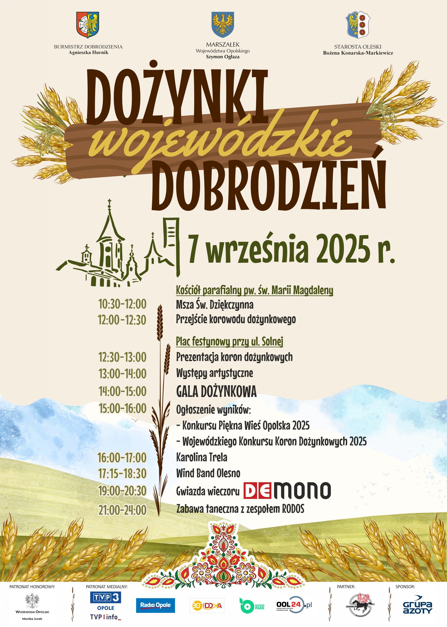 W programie m.in. prezentacja koron dożynkowych, występy artystyczne, gala dożynkowa z ogłoszeniem wyników konkursów „Piękna Wieś Opolska 2025” i „Wojewódzki Konkurs Koron Dożynkowych 2025”. Na scenie wystąpią Karolina Trela, Wind Band Olesno oraz gwiazda wieczoru – zespół De Mono. Imprezę zakończy zabawa taneczna z zespołem Rodos.