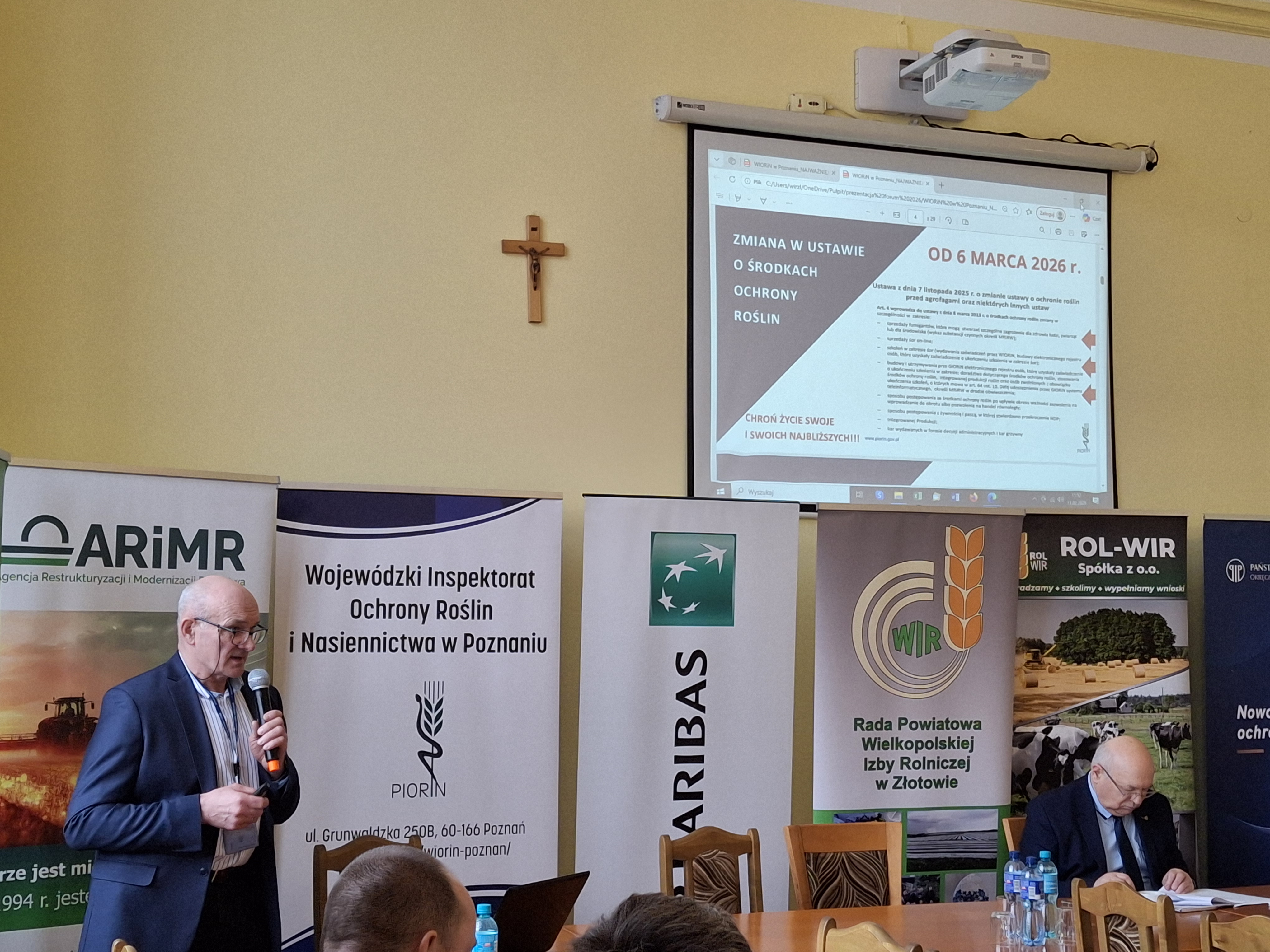 Kierownik Oddziału w Złotowie w krótkiej prezentacji zwrócił uwagę na zagadnienia związane ze stosowaniem preparatów przeznaczonych do fumigacji. Przybliżył nowe regulacje prawne w zakresie warunków nabywania fumigantów zawierających substancje czynne takie jak fosforek glinu, fosfrek magnezu i fluorek sulfurylu oraz nabywania pozostałych środków ochrony roślin. Zaakcentował konieczność posiadania stosownych zaświadczeń o ukończeniu odpowiednich szkoleń. Omówił zagadnienie dotyczące elektronicznej dokumentacji w zakresie stosowanych środków ochrony roślin i przepisy prawne w tym zakresie. Podkreślił, że w bieżącym roku zasady prowadzenia ewidencji zabiegów pozostają bez zmian. Odnosząc się do zagadnienia stosowania materiału siewnego prelegent zaakcentował że kwalifikowany materiał siewny to pierwszy element, który znacząco wpływa na powodzenie w prowadzeniu upraw różnych gatunków roślin rolniczych. Zwrócił uwagę, że kwalifikowany materiał siewny musi być zaopatrzony w etykiety nasienne, a w przypadku niektórych gatunków etykieta jest zarazem paszportem roślin. Zachęcał do zachowywania w/w etykiet na wypadek ewentualnych reklamacji materiału siewnego.