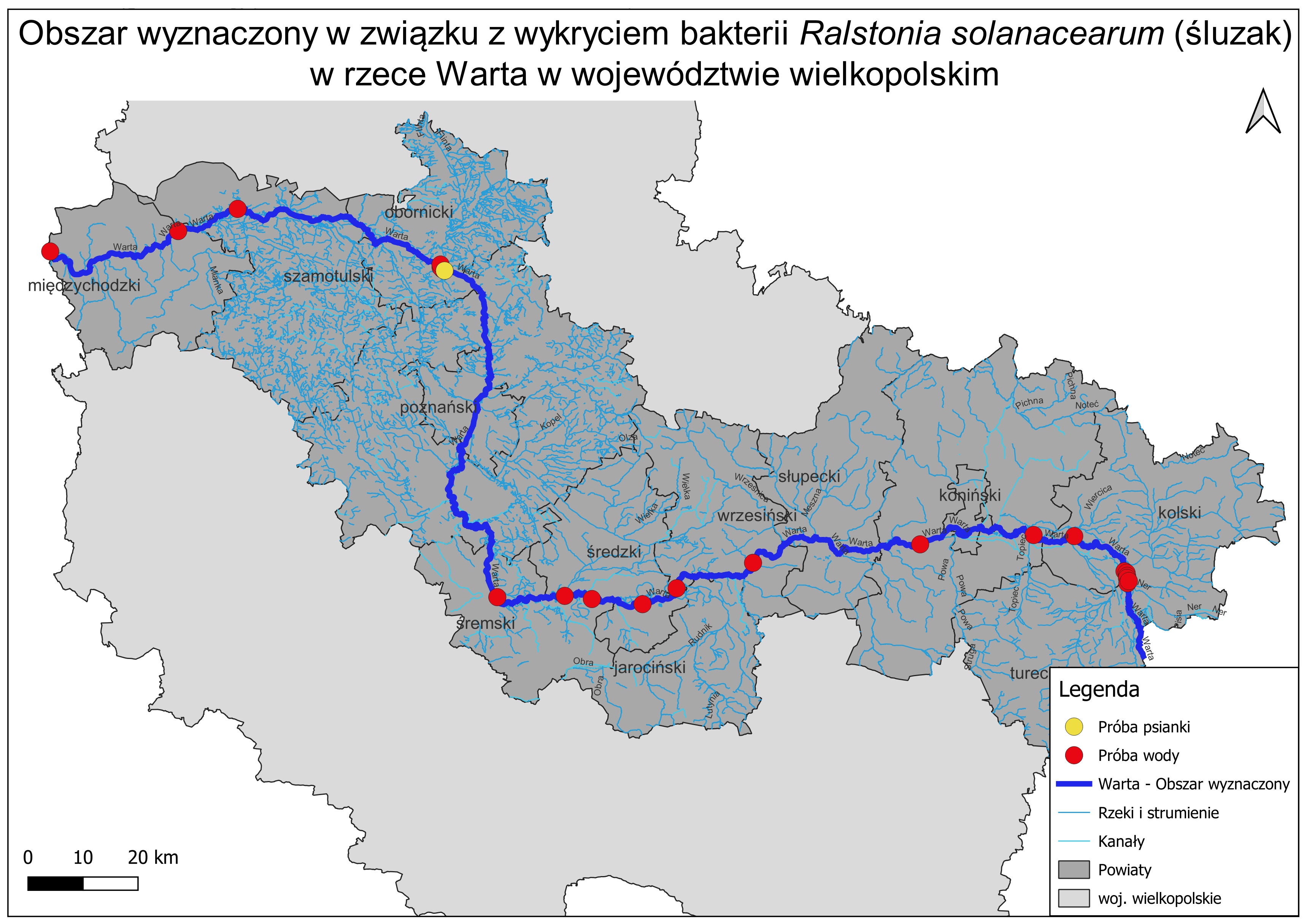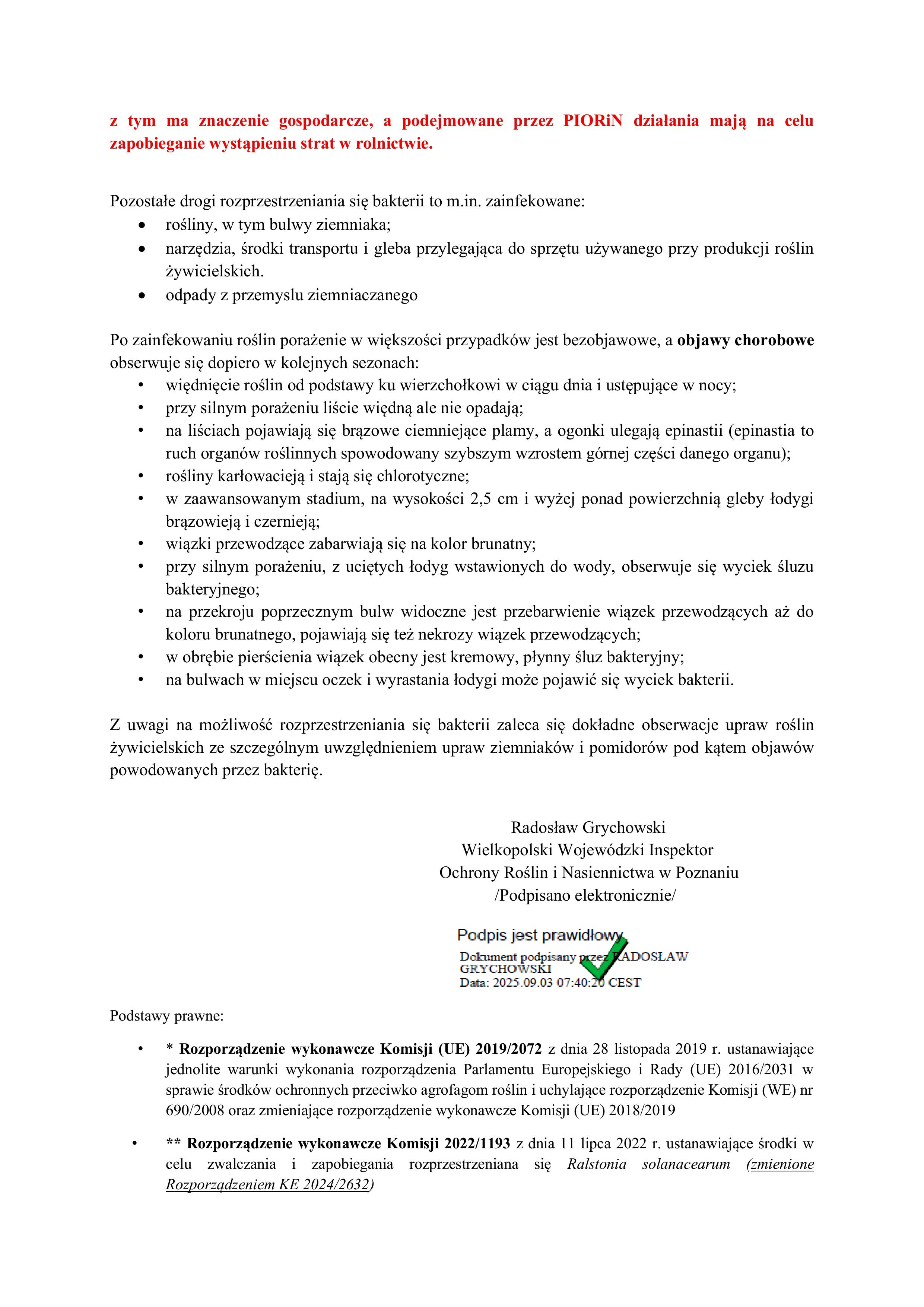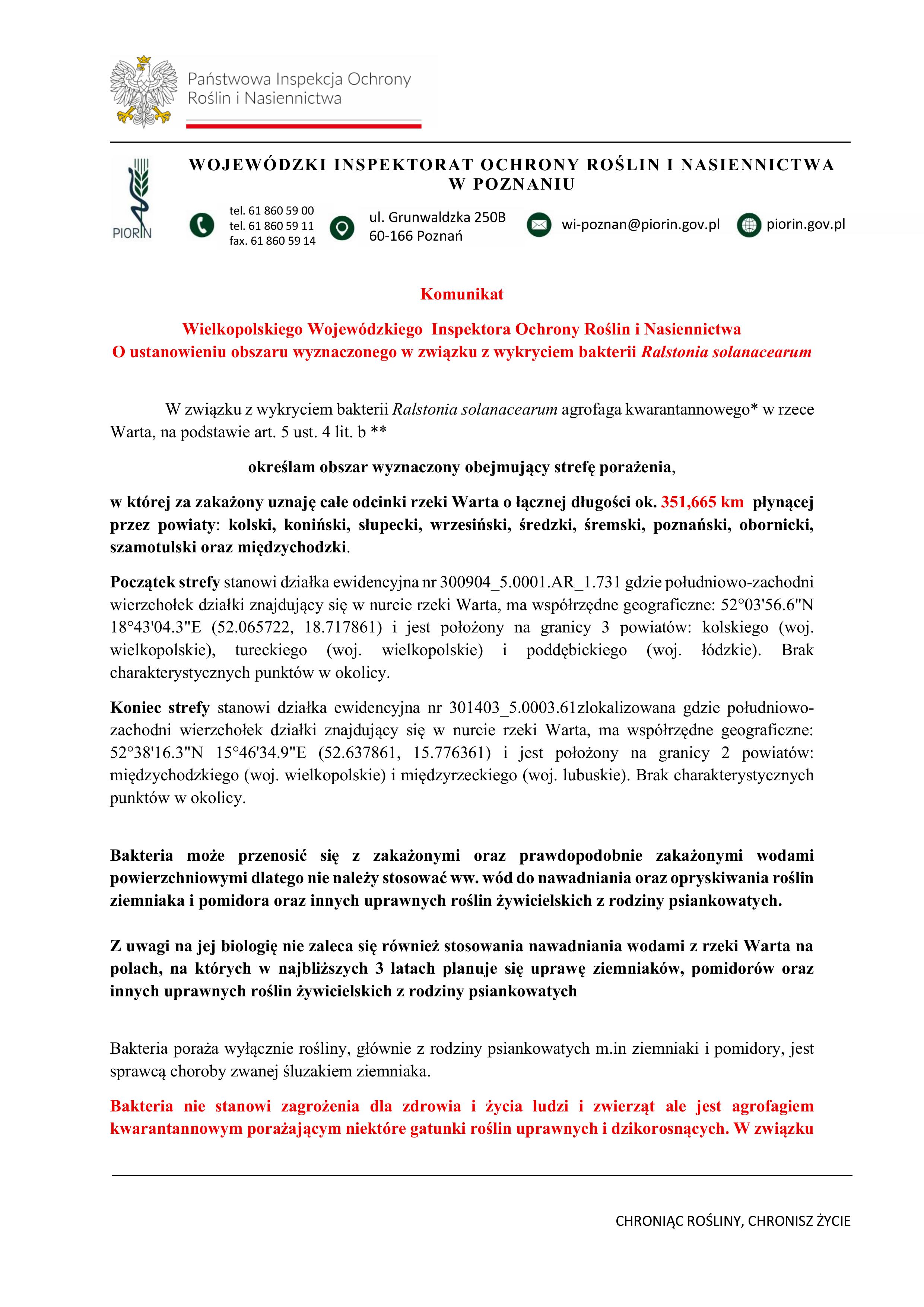 WIELKOPOLSKI WOJEWÓDZKI INSPEKTOR OCHRONY ROŚLIN I NASIENNICTWA OKREŚLIŁ OBSZAR WYZNACZONY W ZWIĄZKU Z WYKRYCIEM BAKTERII Ralstonia solanacearum (śluzak ziemniaka) W RZECE WARTA