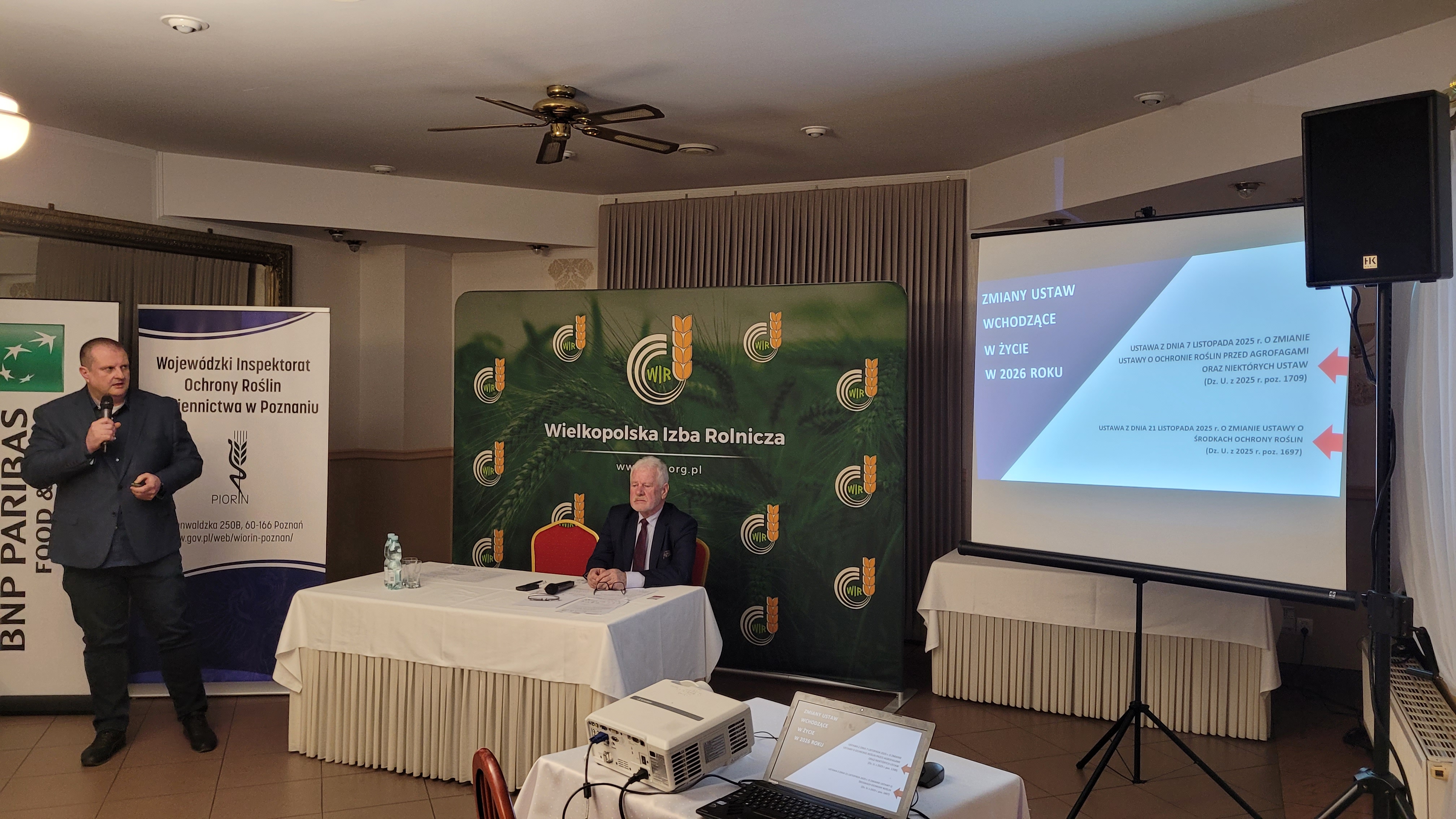 Zagadnienia dotyczące zadań realizowanych przez Wojewódzki Inspektorat Ochrony Roślin i Nasiennictwa w Poznaniu omówił Damian Szkudlarek – główny specjalista w Oddziale w Poznaniu, który jako jeden z pierwszych prelegentów przedstawił zebranym najważniejsze zagadnienia dotyczące rolnictwa w kontekście działalności WIORiN w Poznaniu w 2026 roku. Poruszył między innymi temat nowelizacji ustawy o środkach ochrony roślin, w tym zagadnienia dotyczące nowych regulacji prawnych w zakresie obrotu środkami ochrony roślin. Szczegółowo omówił także nowe zasady obrotu fumigantami oraz zmiany dotyczące prowadzenia dokumentacji zastosowanych środków ochrony roślin w formie elektronicznej. Pelegent przedstawił potencjalne zagrożenia wynikające z zakupu środków ochrony roślin z nielegalnego źródła i konsekwencje prawne związane ze stosowaniem takich środków. Zainteresowanie wzbudził temat związany z bezpiecznym zakupem środków ochrony roślin drogą internetową oraz temat przepisów fitosanitarnych dotyczących eksportu zbóż do krajów spoza Unii Europejskiej.
