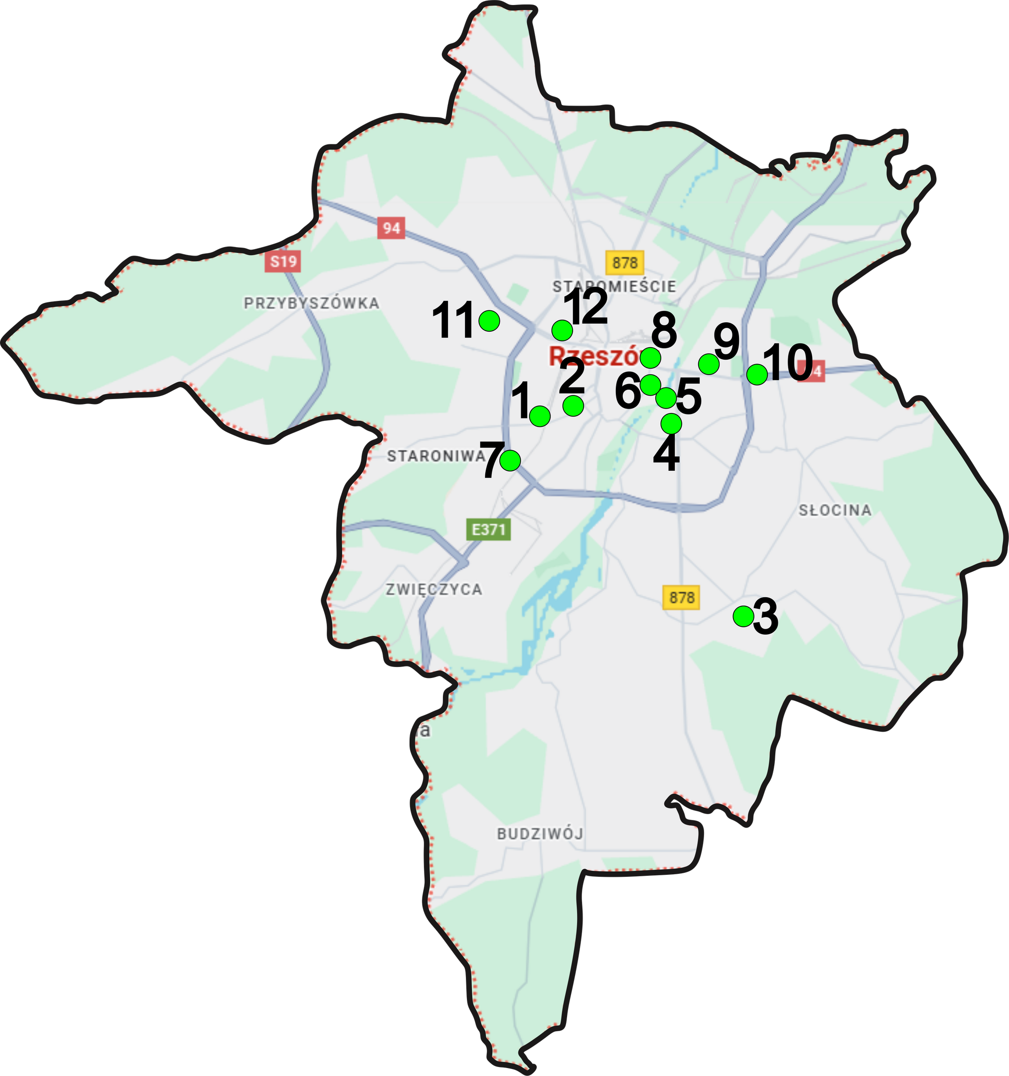 w Czechach, Niemczech i Polsce. W naszym kraju po raz pierwszy zaobserwowany został w 2019 roku w Opolu, a kolejne przypadki jego obecności potwierdzono w Poznaniu, Krakowie i na Mazowszu [Królik i in. 2023, Szcześniak i in. 2024, Hilszański i in. 2025]. W Rzeszowie po raz pierwszy zaobserwowany został wiosną bieżącego roku na terenie Centralnego Laboratorium GIORiN [PIORiN 2025]. W drugiej połowie czerwca czyli już kilka tygodni później, na terenie kampusu Uniwersytetu Rzeszowskiego w dzielnicy Zalesie odnaleźliśmy drzewa ze świeżymi otworami wylotowymi dumka. Co istotne, porażone drzewa od kilku już lat były regularnie kontrolowane pod kątem obecności tego szkodnika. W naszym przekonaniu dowodzi to, że gatunek pojawił się na terenie naszego miasta dopiero w ostatnim czasie. W dalszej kolejności podjęliśmy poszukiwania innych stanowisk dumka na terenie Rzeszowa w efekcie czego odnaleziony został w następujących lokalizacjach: