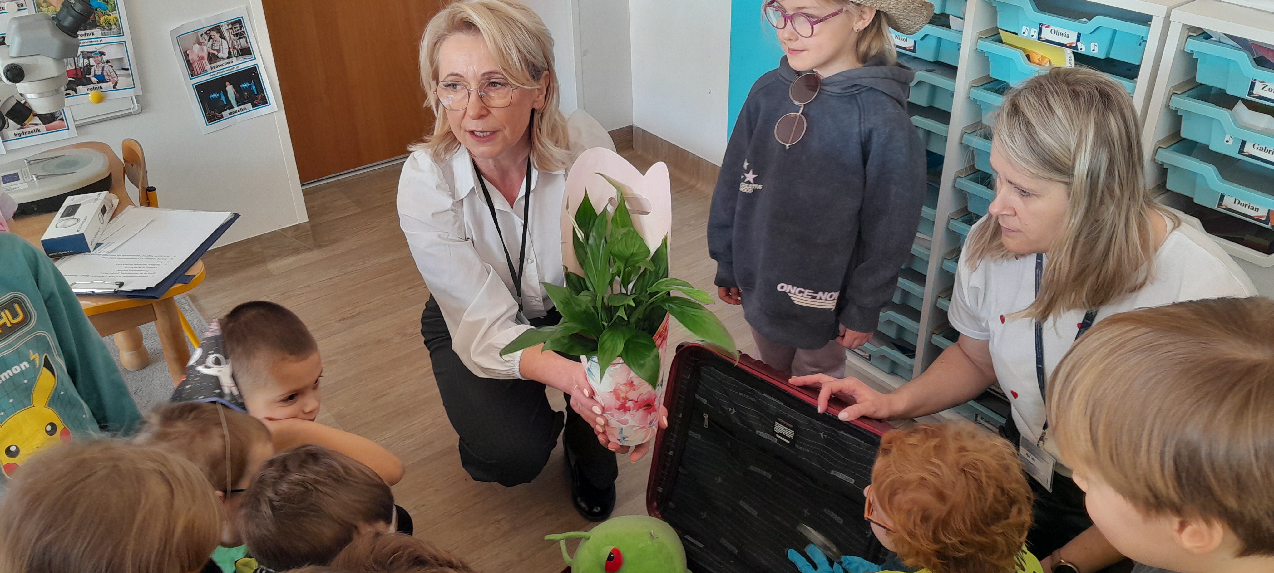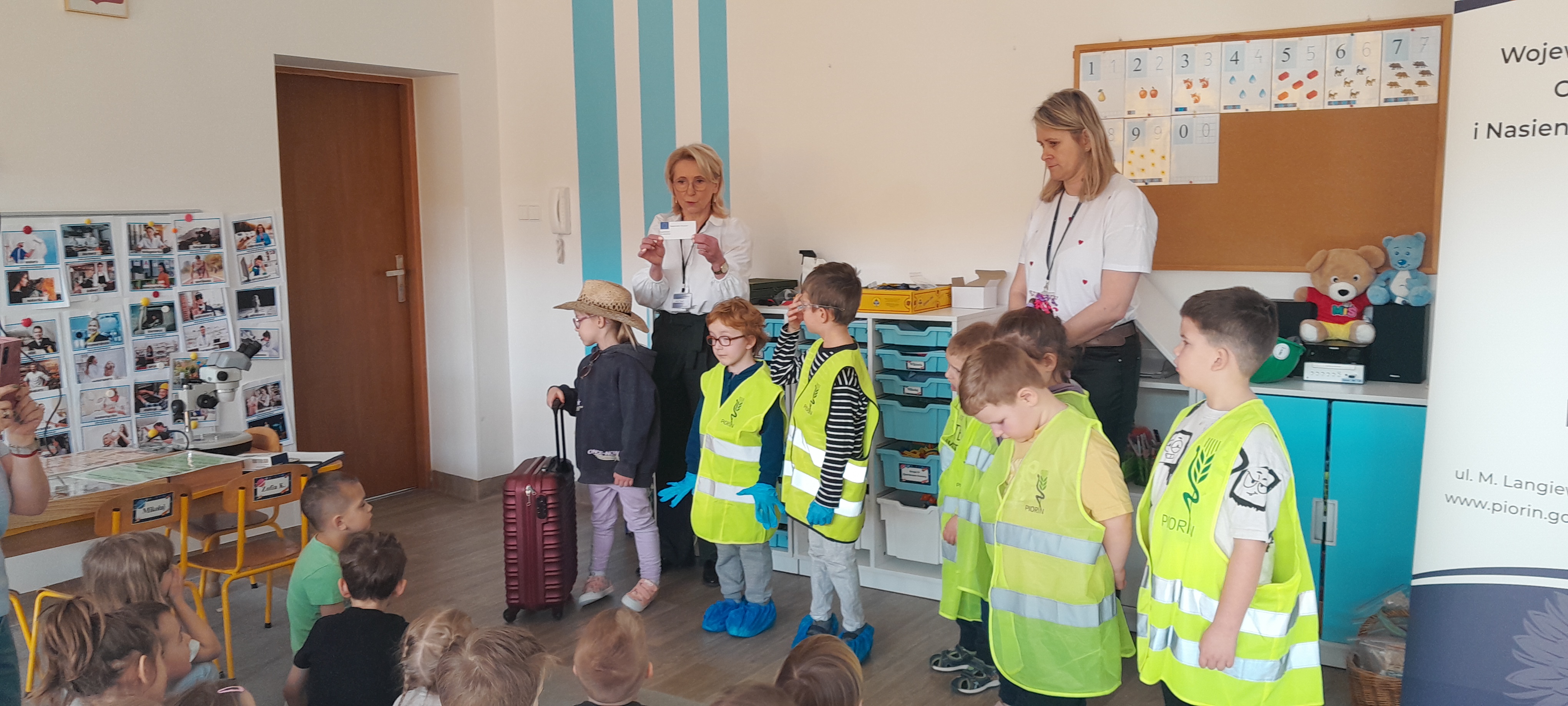 Podczas spotkania pani Kierownik Marzena Siemek opowiedziała przedszkolakom, na czym polega praca inspektorów Państwowej Inspekcji Ochrony Roślin i Nasiennictwa. Dzieci dowiedziały się jaką rolę pełnią w naszym życiu rośliny, jak należy je pielęgnować, a także jakie są główne czynniki wywołujące choroby roślin. Dzieci miały okazję obejrzeć nasiona roślin zbożowych, pastewnych