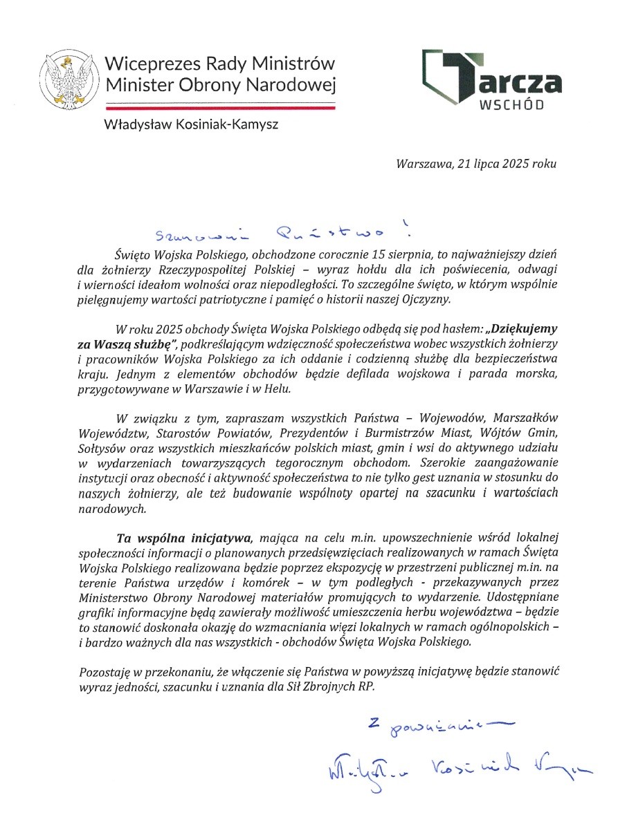 Zachęcamy wszystkie instytucje, organizacje oraz obywateli do aktywnego uczestnictwa w tej kampanii. Poniżej załączamy list wicepremiera i ministra obrony narodowej dot. promocji Święta Wojska Polskiego z zaproszeniem do włączenia się w tę inicjatywę, oferując szereg narzędzi do promocji. Dzięki tym materiałom możliwe będzie efektywne wizualizowanie i szerzenie idei obchodów, zarówno w mediach społecznościowych, jak i na stronach internetowych.