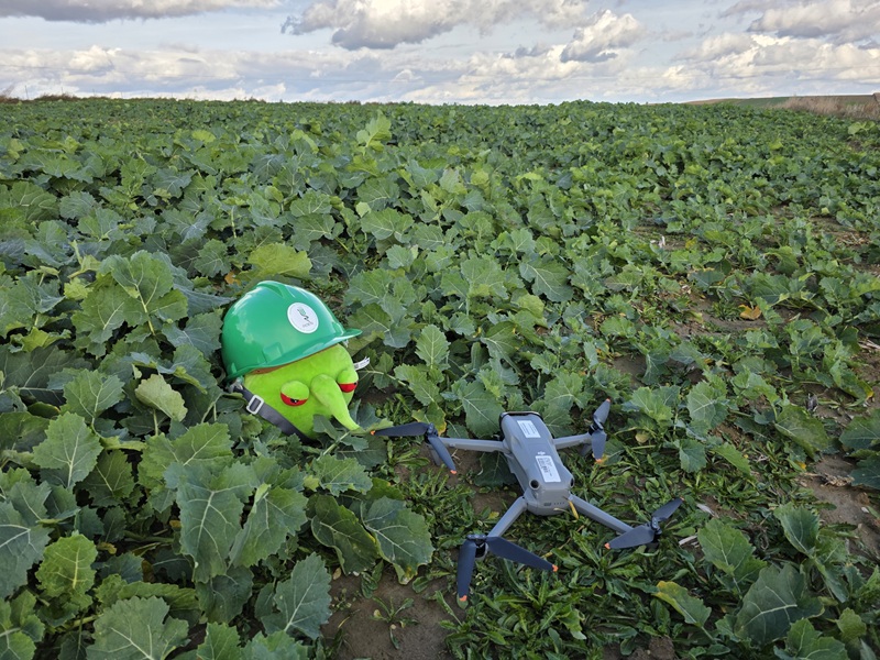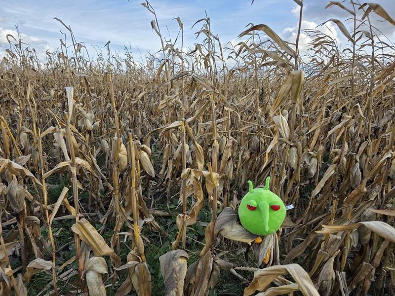 Nie mogło zabraknąć wizyty na polach! Pesty odwiedził plantacje kukurydzy i rzepaku, aby sprawdzić, jak rosną i przygotowują się do zimy. Kukurydza stała jeszcze dumnie w rzędach, a młody rzepak pokrywał pola gęstym, zielonym dywanem. Wszystko wyglądało zdrowo i dorodnie – bez szkodników.