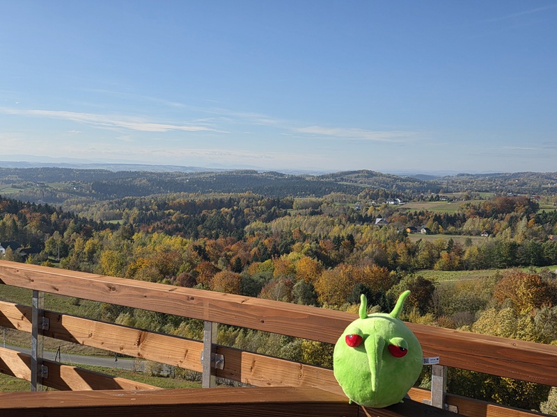 Na koniec wyprawy Pesty odwiedził Jodłową, wspiął się na wieżę widokową i z zachwytem spoglądał na krajobraz Beskidu Niskiego – złote lasy, pola i pagórki w ciepłych barwach. Zatrzymał się na chwilę, by nacieszyć oczy ciszą i kolorami natury.