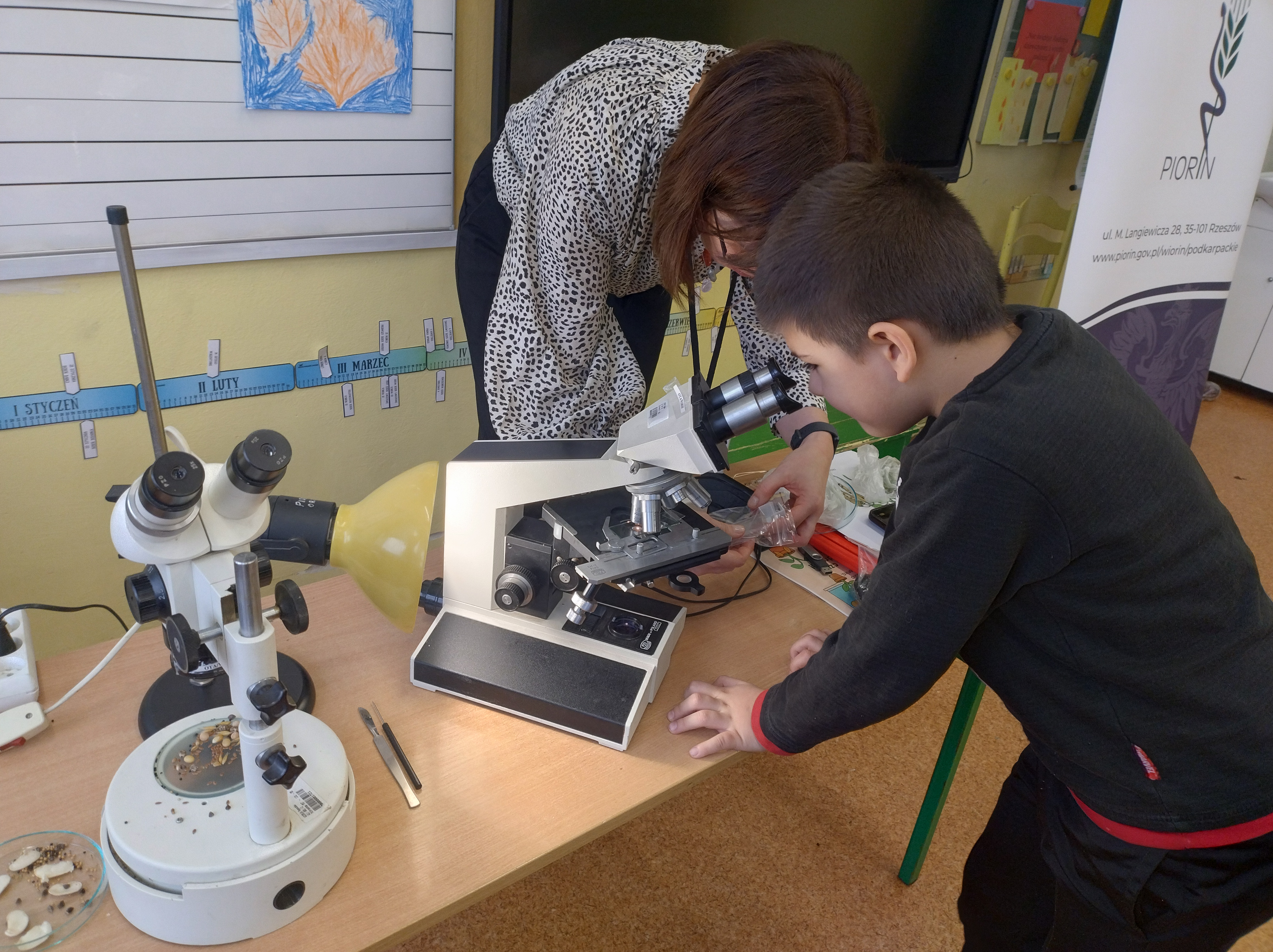 Nie zabrakło części praktycznej - dzieci z entuzjazmem oglądały nasiona pod binokularem, porównując ich kształt, kolor i wielkość. Dużą atrakcją były także kiełkujące nasiona słonecznika, fasoli, kukurydzy i pszenicy, dzięki którym uczniowie mogły obserwować początkowe etapy rozwoju roślin.