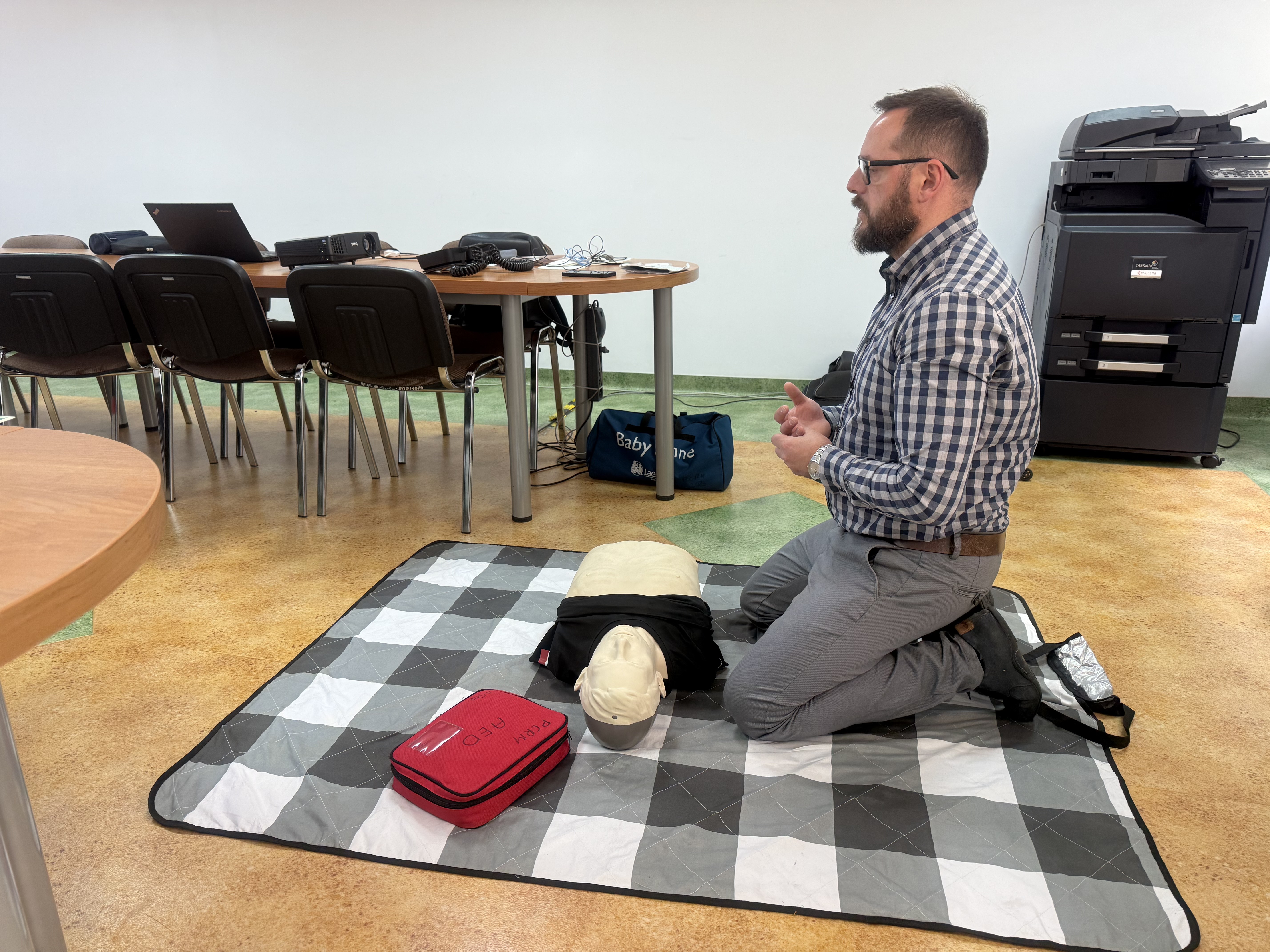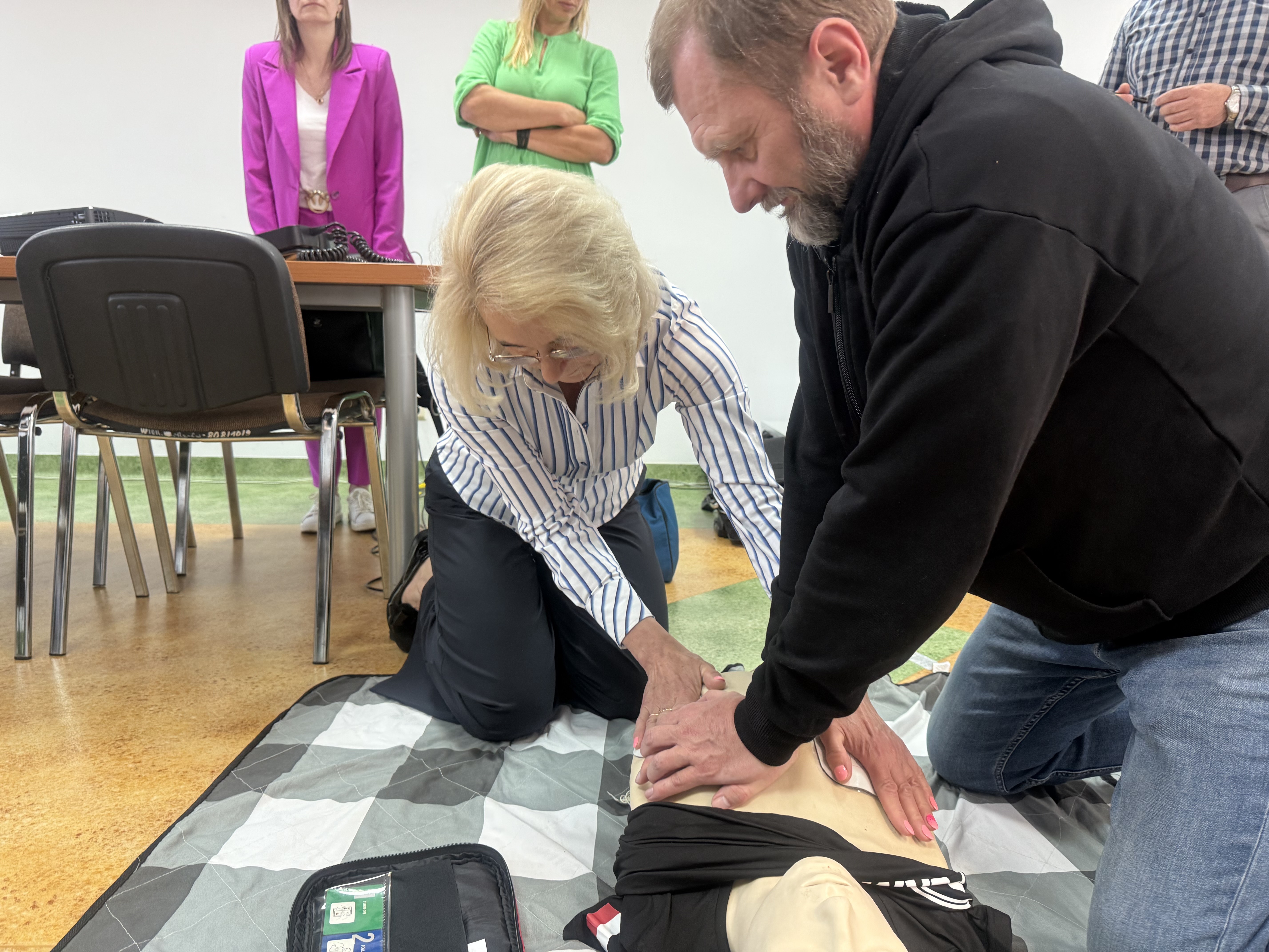 Jednym z najważniejszych elementów szkolenia były ćwiczenia praktyczne z zakresu udzielania pierwszej pomocy. Uczestnicy mieli okazję przećwiczyć resuscytację krążeniowo-oddechową (RKO) na profesjonalnym fantomie. Instruktor krok po kroku pokazał, jak prawidłowo wykonać masaż serca oraz sztuczne oddychanie, a następnie każdy z pracowników mógł samodzielnie przećwiczyć nabyte umiejętności.