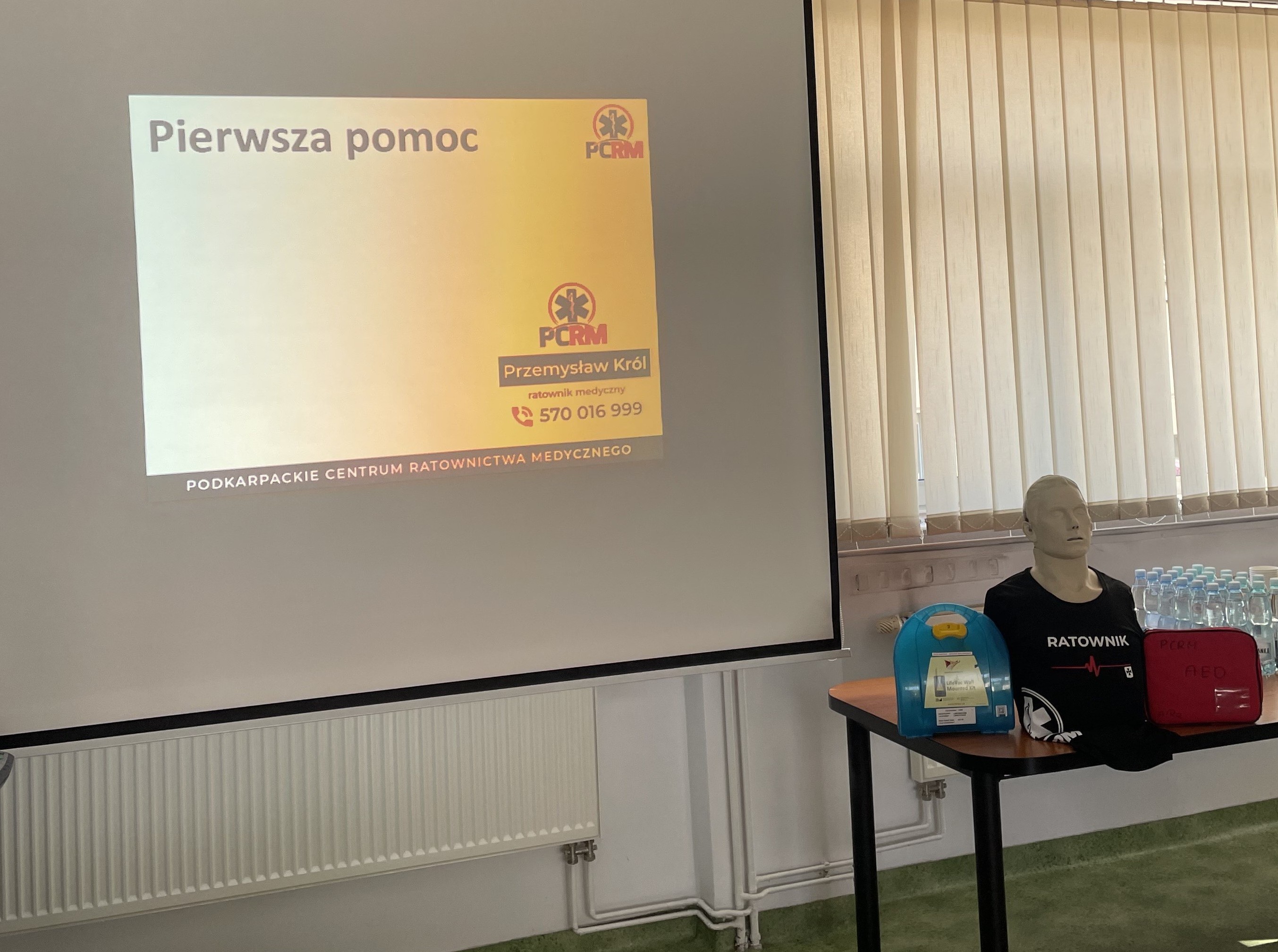 Szkolenie zostało przeprowadzone przez Podkarpackie Centrum Ratownictwa Medycznego, którego przedstawiciel, doświadczony ratownik medyczny Pan Przemysław Król omówił kluczowe zagadnienia związane z bezpiecznym wykonywaniem obowiązków służbowych. Poruszono tematy takie jak aspekty prawne udzielania pierwszej pomocy, postępowanie z osobą nieprzytomną, wybrane jednostki chorobowe, pierwsza pomoc przedlekarska oraz zasady użycia defibrylatora AED.