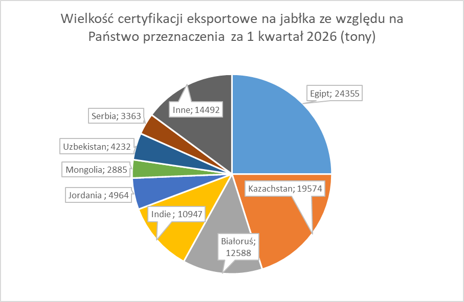 Wykres 3: Wielkośc certyfikacji eksportowej na jabłka ze względu na Państwo przeznaczenia za 1 kwartał 2026.