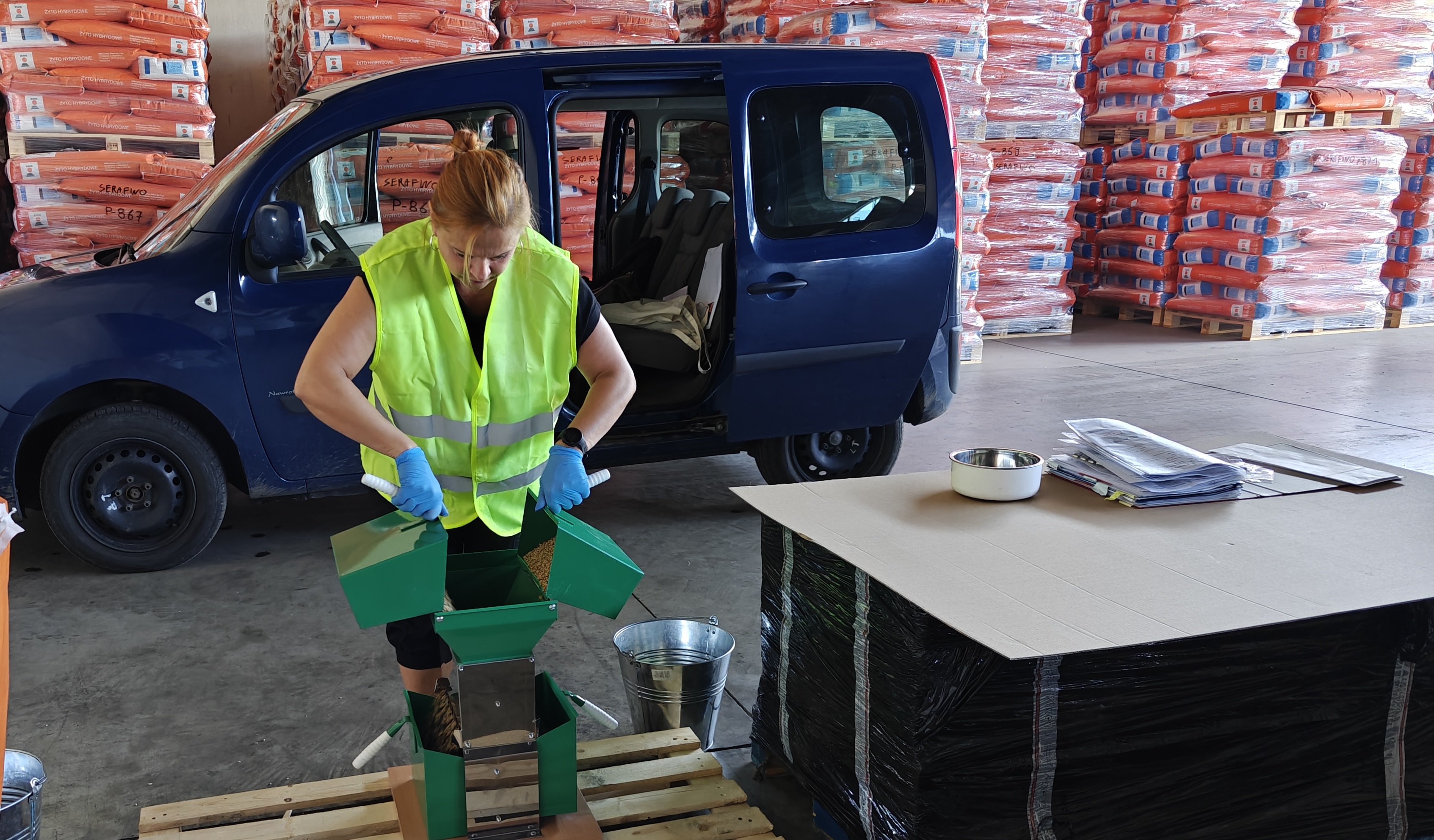 Próbobiorca w magazynie przedsiębiorcy sprawdza zgodność danych zawartych w złożonym wniosku ze stanem faktycznym oraz wypełnia listę kontrolną. Po sprawdzeniu czystości sprzętu przystępuje do pobierania prób.