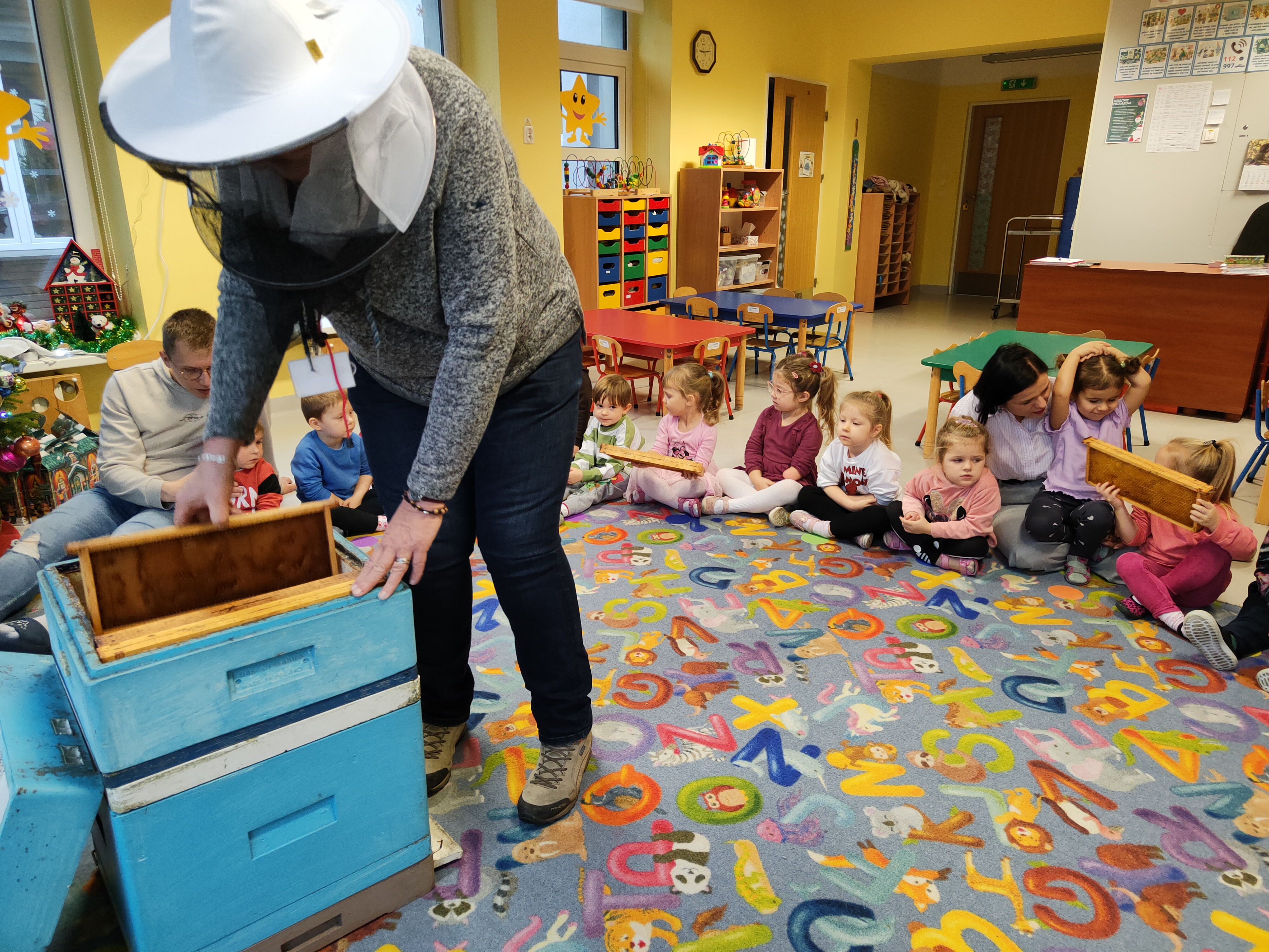 9 grudnia br. dzieci z grup „Gwiazdeczki” i „Zajączki” z Przedszkola Samorządowego w Miliczu miały okazję spotkać się z inspektorami z Wojewódzkiego Inspektoratu Ochrony Roślin i Nasiennictwa we Wrocławiu Oddziału w Miliczu, którzy przeprowadzili dla nich zajęcia praktyczne na temat owadów zapylających i ich roli w przyrodzie. Inspektorzy z pomocą krótkiego filmu pokazali maluchom rolę pszczół i innych zapylaczy roślin w procesie powstania owoców i nasion. Każde dziecko miało okazję zobaczyć, dotknąć i powąchać jak pachnie pszczeli ul i ramki. Dzieci mogły zobaczyć jak wygląda praca pszczół wewnątrz ula. Dowiedziały się m.in. jak wygląda komórka w ramce pszczelej, czy pszczoła może sama budować plaster i gdzie pszczoły składają nektar, pyłek oraz miód. Ponadto zdobyły wiedzę w jakich komórkach matka pszczela (królowa) składa jajeczka z których rozwijają się pszczoły robotnice i trutnie (osobniki męskie), czym karmione są młode larwy, ile pszczół jest w ulu i jak długo żyje pszczoła w zależności od pory roku.
