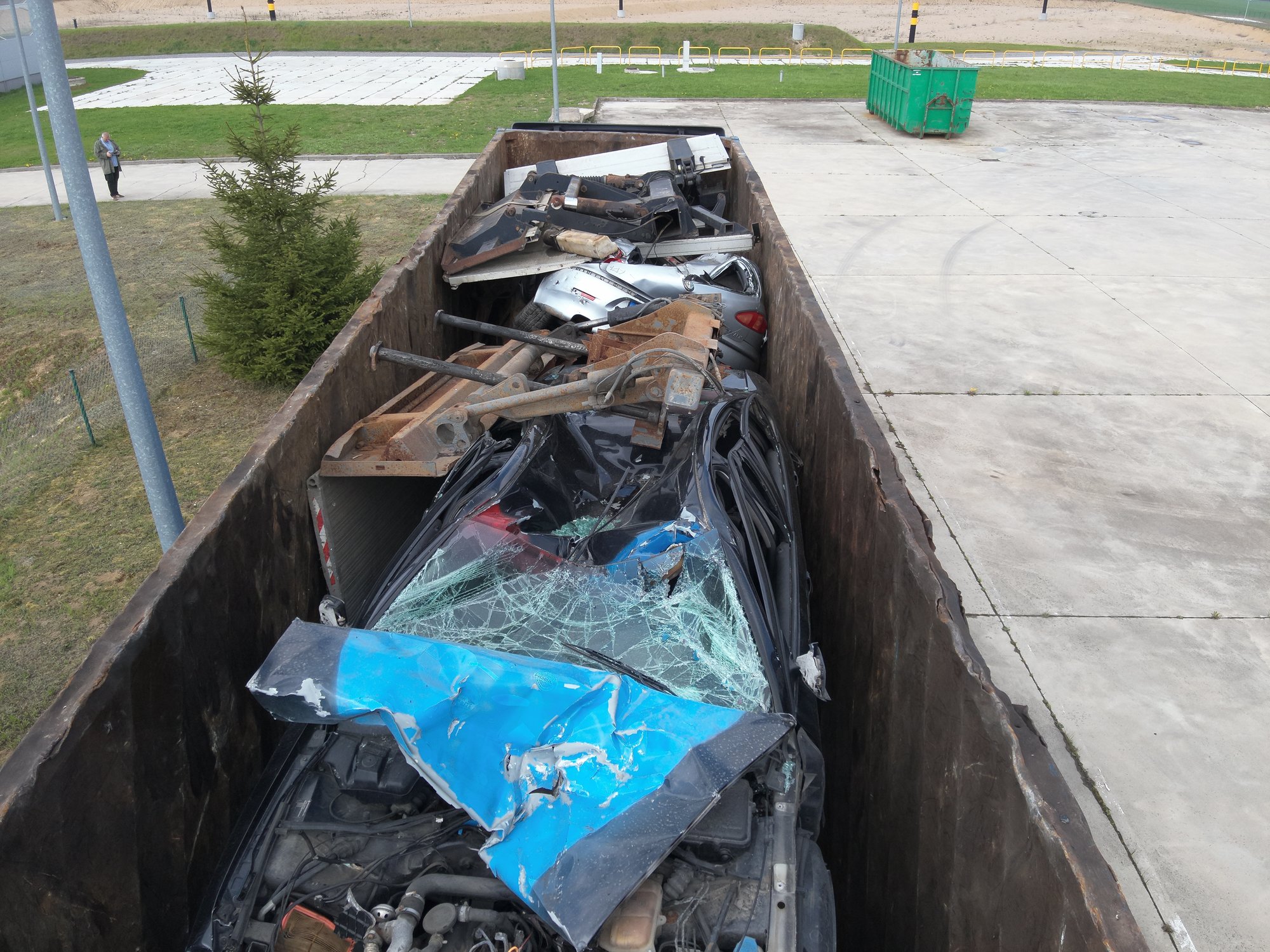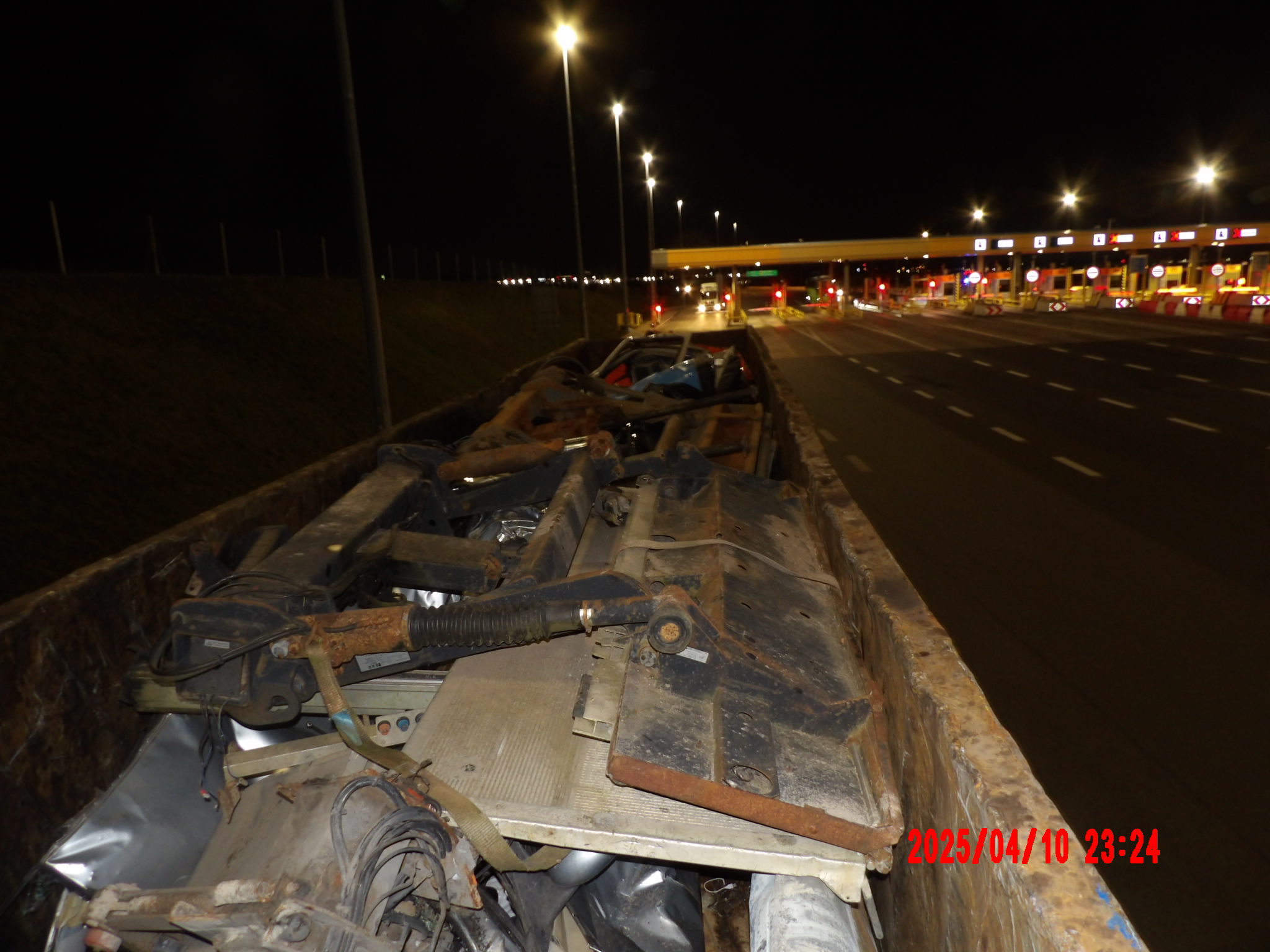 W trakcie weryfikacji załadunku kontrolowanego pojazdu stwierdzono, że w stalowym kontenerze znajdują się zniszczone części pojazdów oraz pojazdy w znacznym stopniu uszkodzone. W związku z ujawnionymi podczas kontroli naruszeniami przepisów dotyczących szczegółowych wymagań w zakresie transportu odpadów, pojazd został zatrzymany i skierowany na wyznaczony parking, wskazany w Wojewódzkim Planie Gospodarki Odpadami.