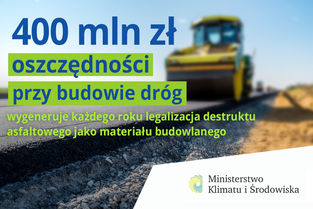 Ponad 400 mln zł oszczędności wygeneruje każdego roku legalizacja destruktu asfaltowego jako materiału budowlanego. Dzięki planowanej zmianie przepisów kruszywo asfaltowe, uznawane jako odpad, posłuży wkrótce jako pełnowartościowy materiał do budowy dróg. 21 października 2021 r. minister klimatu i środowiska podpisał rozporządzenie ws. określenia szczegółowych kryteriów stosowania warunków utraty statusu odpadów dla odpadów destruktu asfaltowego.