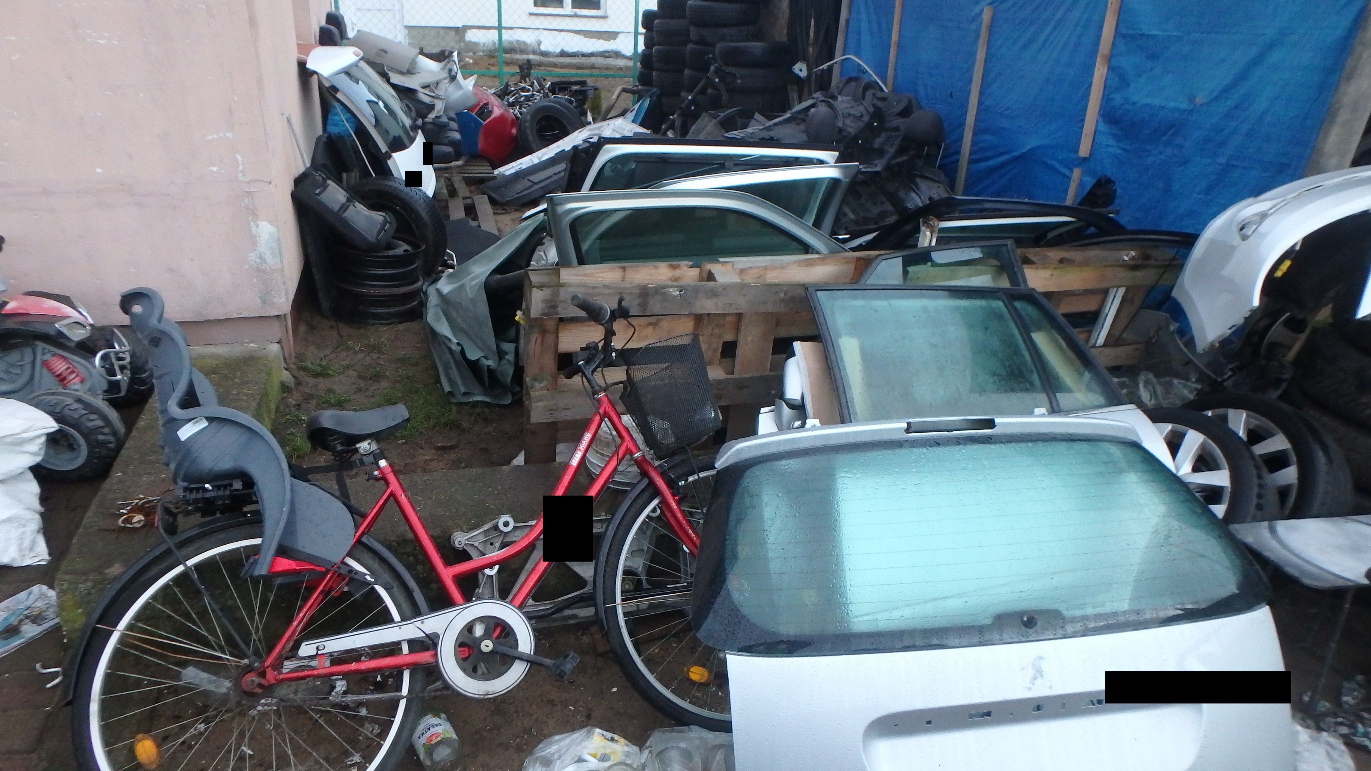 W trakcie czynności kontrolnych na terenie działki stwierdzono kilkanaście pojazdów poddanych w różnym stopniu demontażowi oraz zgromadzone, liczne, używane części samochodowe. Całość znajdowała się na nieutwardzonym terenie oraz w garażu i wiacie.