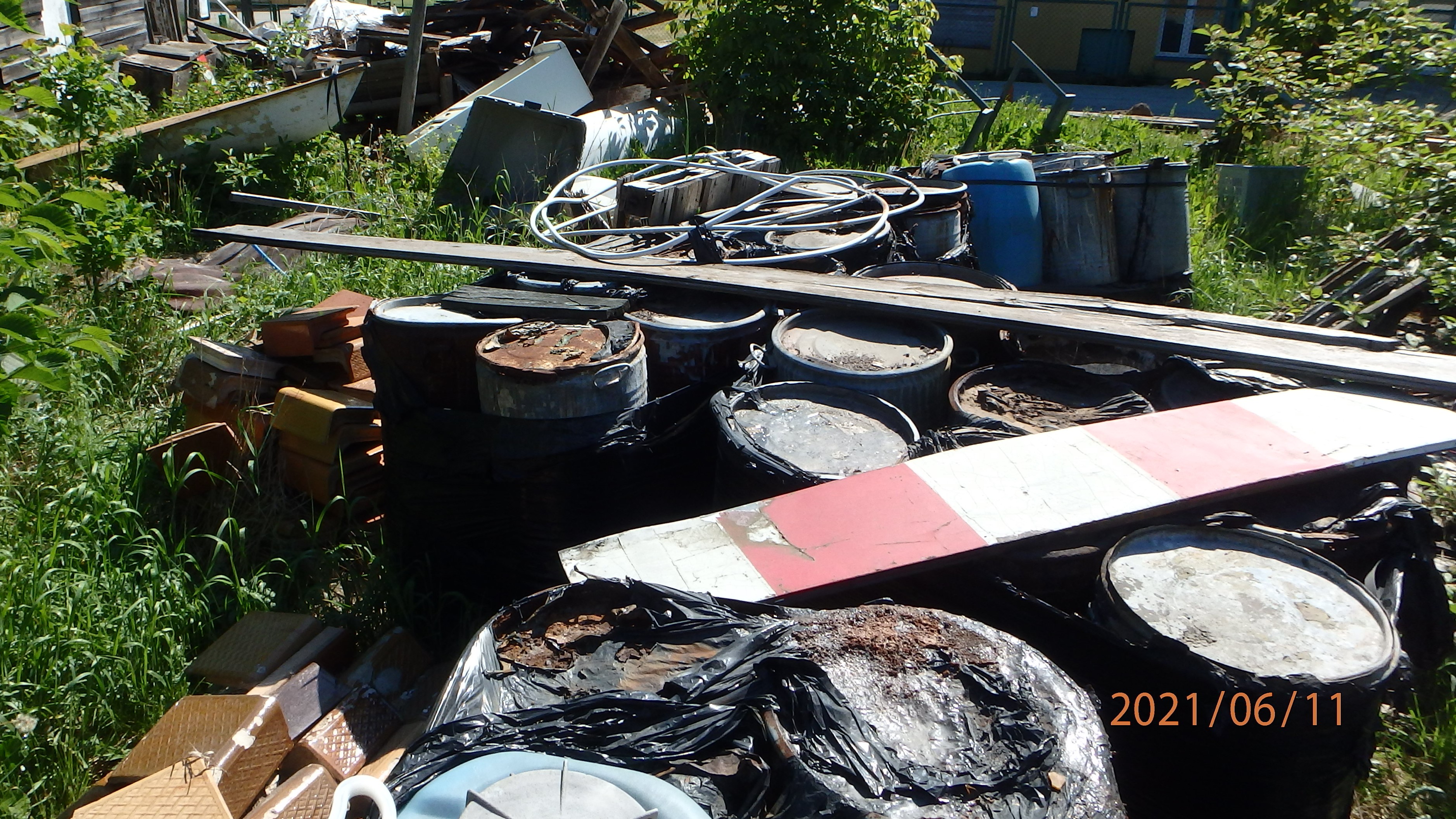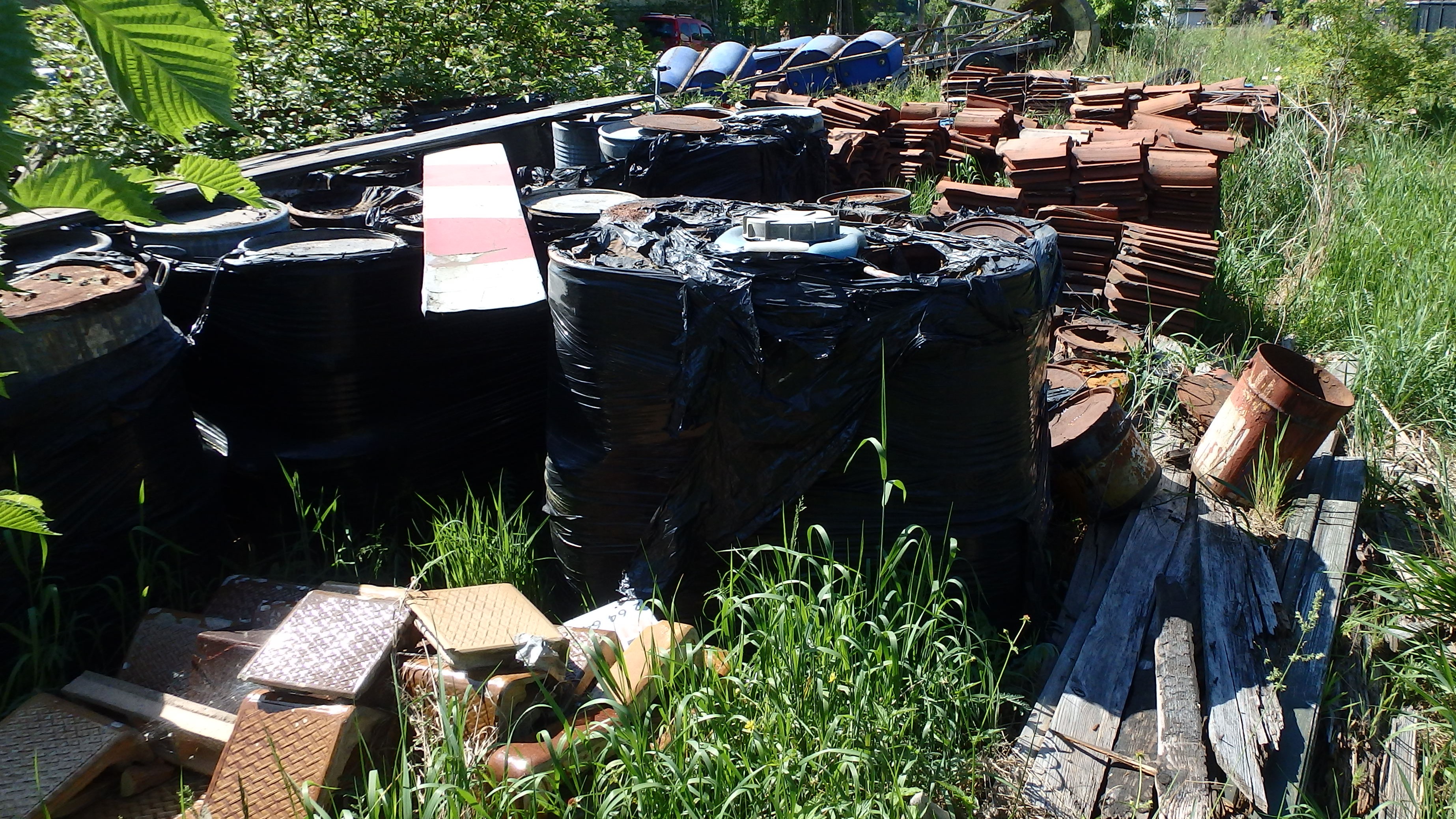 Na nieogrodzonym, niezabezpieczonym terenie, bezpośrednio na gruncie stwierdzono odpady w postaci: drewna, odpadów komunalnych, tworzyw sztucznych, odpadów z włókna szklanego (wyeksploatowany sprzęt wodny), odpady złomu (elementy maszyn), oraz beczki z niezidentyfikowanymi substancjami w ilości ok. 80 sztuk.