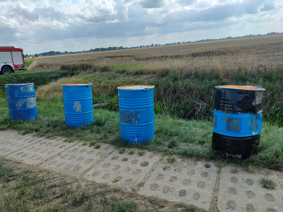 W drugiej lokalizacji stwierdzono 4 beczki o pojemności 200 litrów wypełnione nieznaną substancją, które zostały wydobyte z cieku wodnego i zabezpieczone przez PSP a następnie przewiezione do Punktu Selektywnej Zbiórki Odpadów Komunalnych w Nowym Stawie. Wycieków z beczek i zanieczyszczenia wód rowu nie stwierdzono.