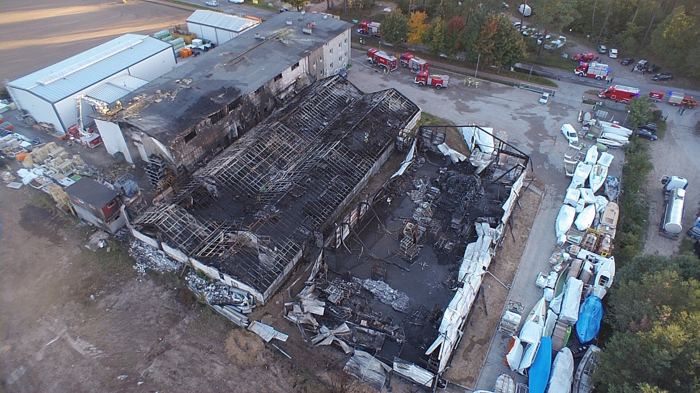 Zgodnie ze wstępnymi ustaleniami, poczynionymi podczas czynności, pożar objął swym zasięgiem 4 budynki znajdujące się na powierzchni ok. 3000 m2, spaleniu uległy materiały wykorzystywane do produkcji łodzi z laminatu, maszyny i urządzenia produkcyjne. W akcji gaśniczej brało udział 41 jednostek PSP, w tym jednostki chemicznego rozpoznania, do gaszenia użyto wody oraz piany gaśniczej.