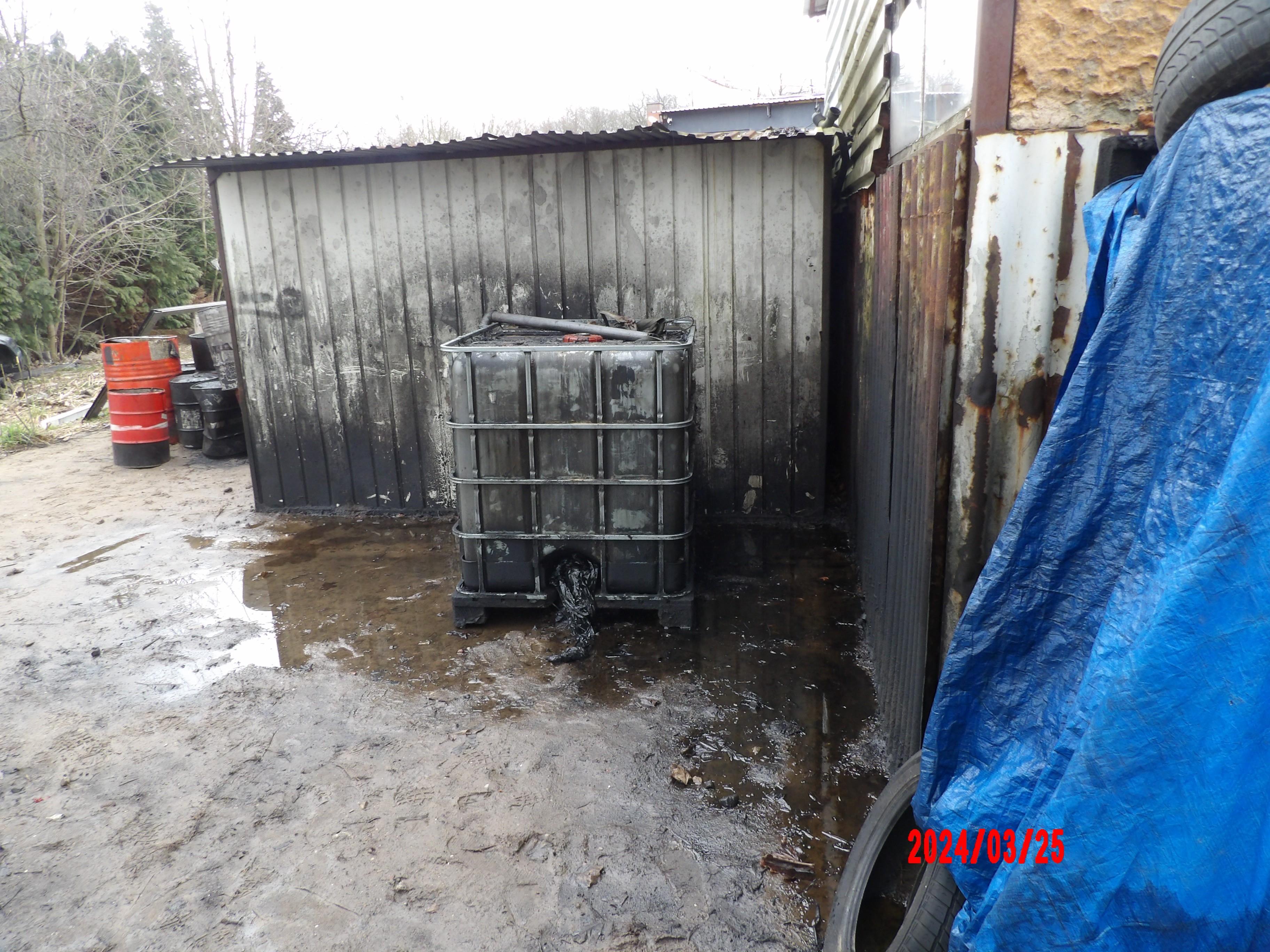 W trakcie oględzin ustalono, że na terenie zakładu są porozrzucane odpady w postaci zużytych opon, części samochodowych, odpadów z tworzyw sztucznych oraz pustych i wypełnionych zużytymi olejami beczek. W miejscach magazynowania beczek stwierdzono plamy rozlanych substancji ropopochodnych. Stwierdzono je także na wskazanym w zgłoszeniu terenie oraz wjeździe na kontrolowany warsztat.