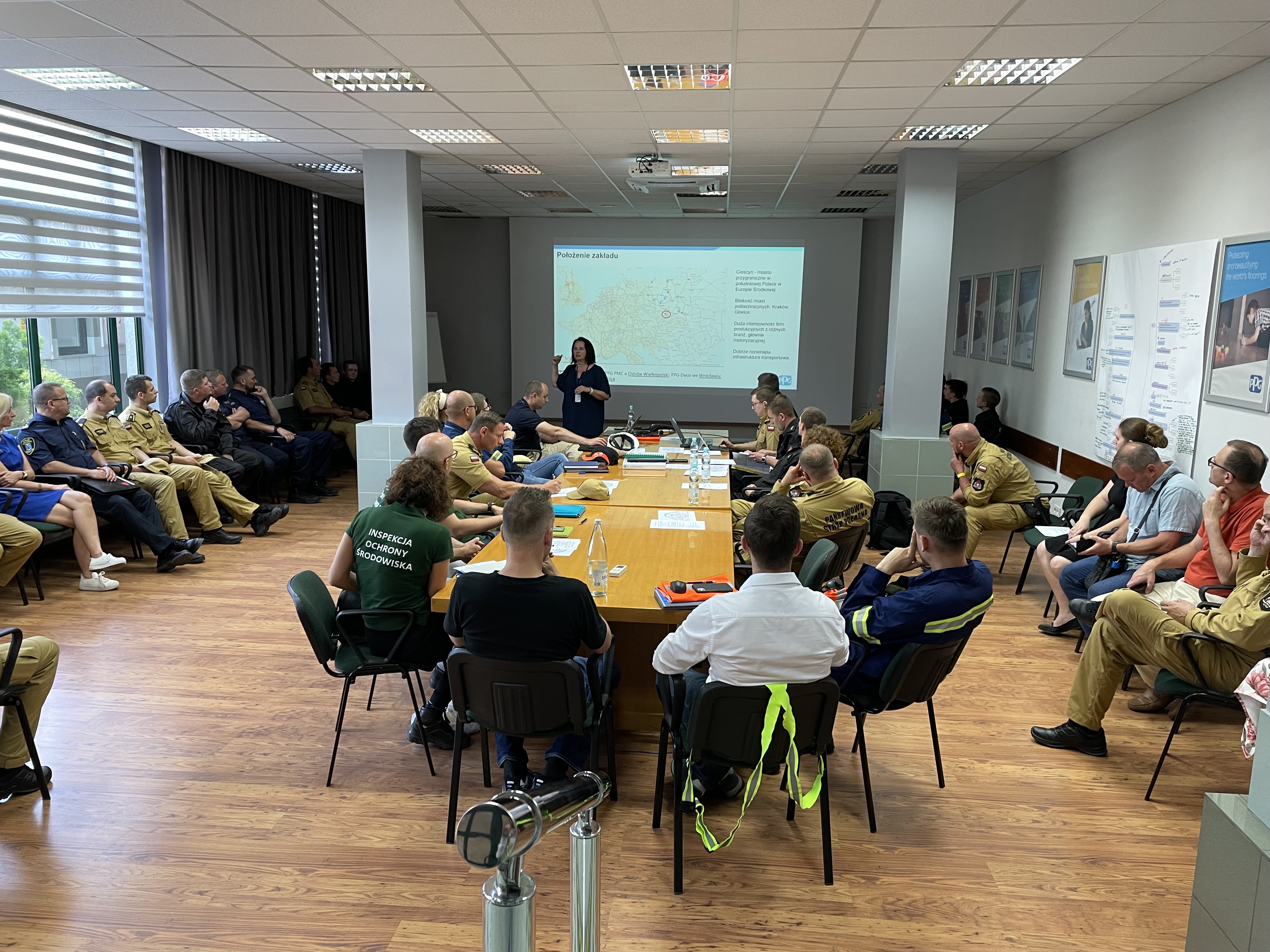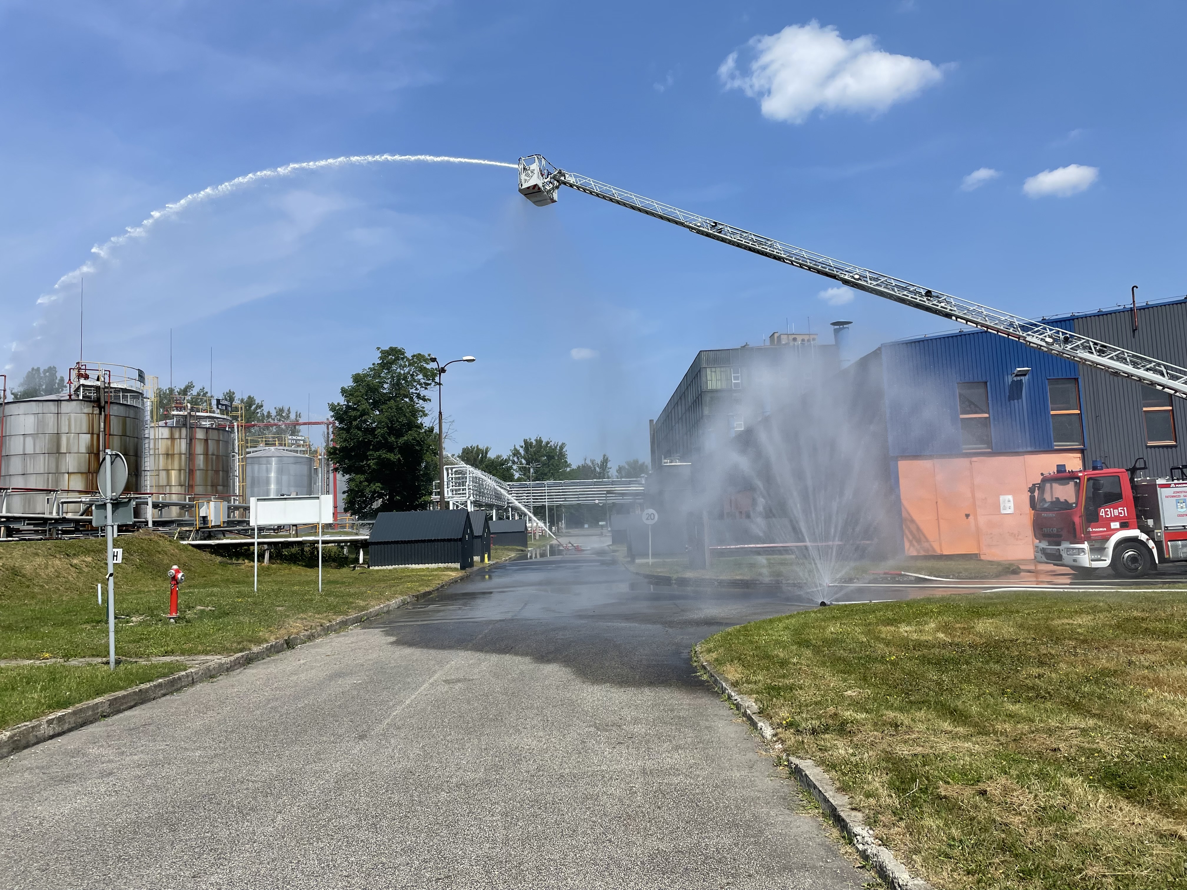 20.06.2023r. odbyły się ćwiczenia jednego ze scenariuszy awaryjnych na terenie zakładu, który ze względu na charakter i ilość magazynowanych substancji został zakwalifikowany jako zakład o dużym ryzku wystąpienia poważnej awarii przemysłowej. Dla zakładów o takim charakterze przepisy przewidują obwiązek tworzenia i weryfikacji, w okresie trzyletnim, zewnętrznego planu operacyjno -ratowniczego. Ćwiczenia organizowane przez Komendę Wojewódzką Państwowej Straży Pożarnej w Katowicach obejmowały część teoretyczną i praktyczną. Część praktyczna polegała na przeprowadzeniu działań operacyjno-ratowniczych w symulowanej sytuacji awaryjnej polegającej na wycieku surowca łatwopalnego ze zbiornika.